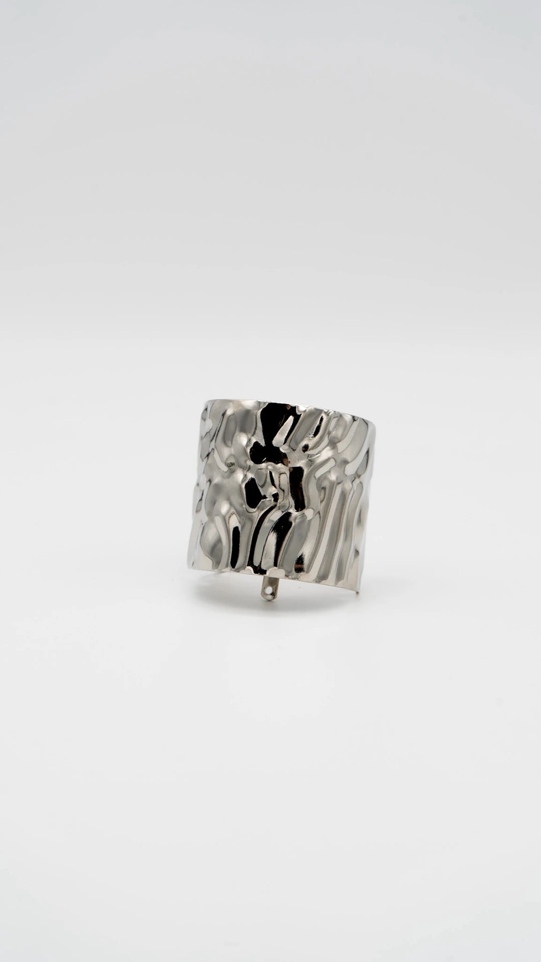Featuring a molten-texture silver cuff paired with a sleek hook pin, this piece slips effortlessly into buns or rubber bands for a secure yet stylish finish. Comes in standard one-size fit only.