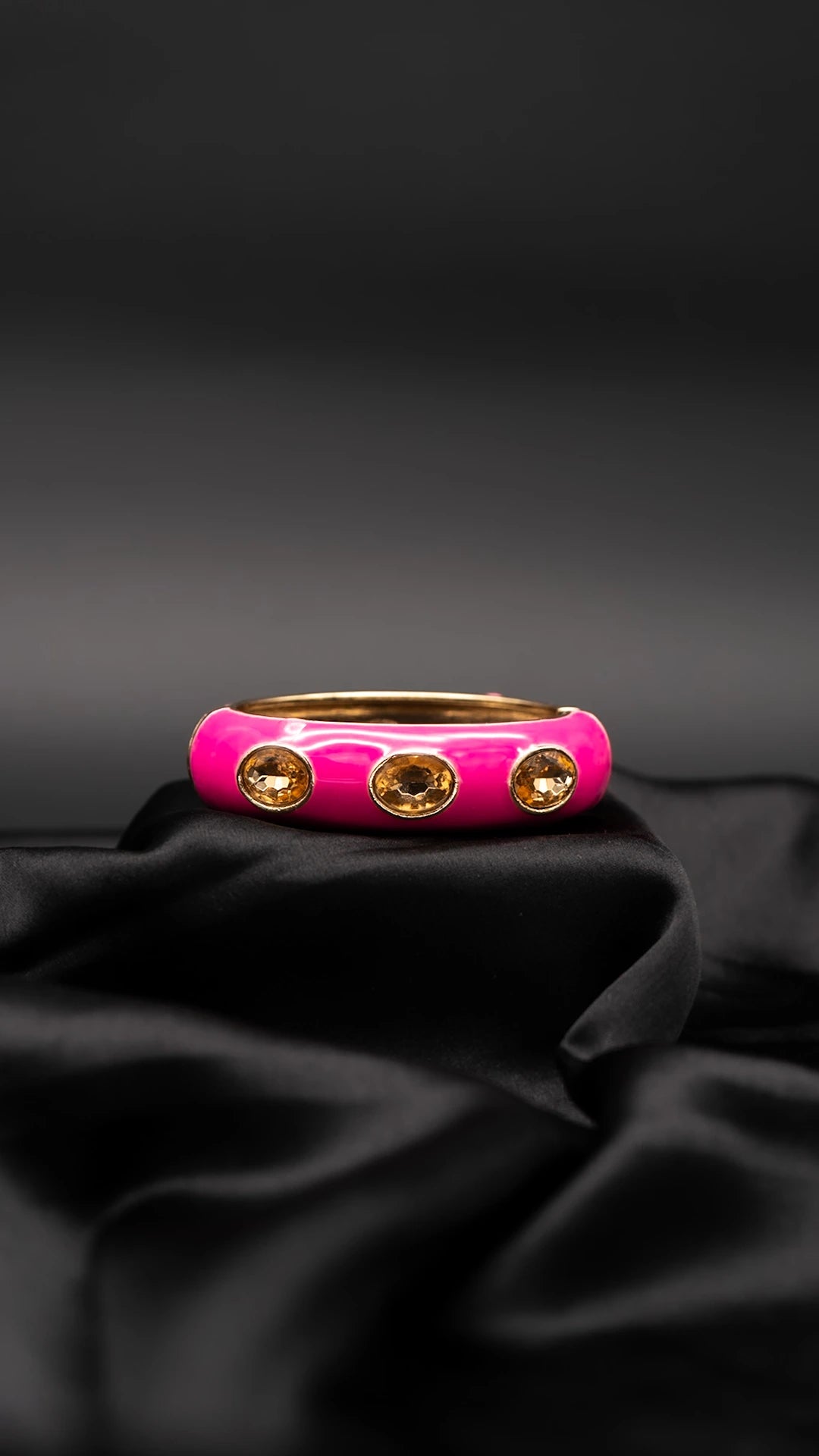 Bold, luminous, and unapologetically vibrant — the Celene Roseburst Bangle is a celebration of playful glamour. Its radiant hot pink enamel is elevated by three shimmering golden crystals, perfectly catching the light with every movement. Whether worn solo or stacked, this piece adds a confident pop of colour to your look.