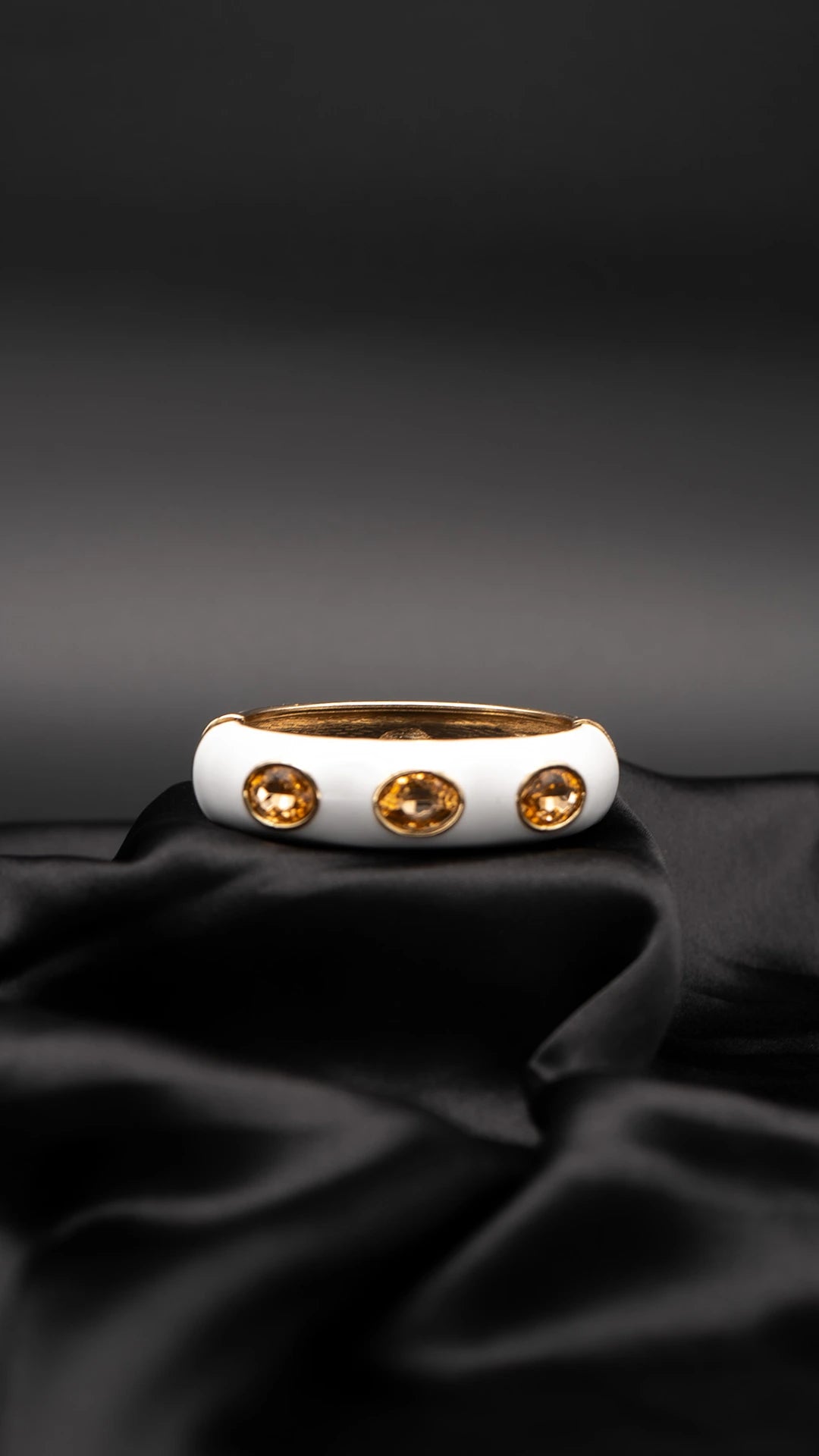 A vision of grace and glow, the Celene Halo Bangle features a pristine white enamel base adorned with radiant golden crystals. Its soft, rounded form paired with glimmering accents gives it a celestial charm—perfect for elevating any look from day to night with subtle elegance.