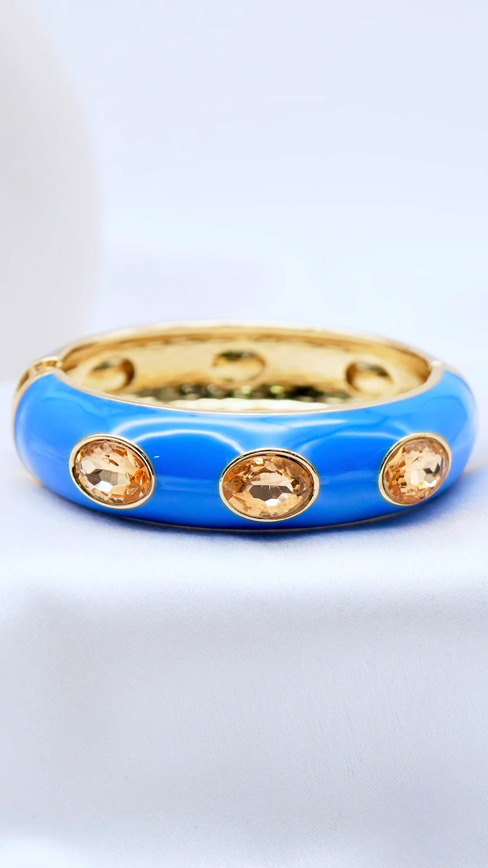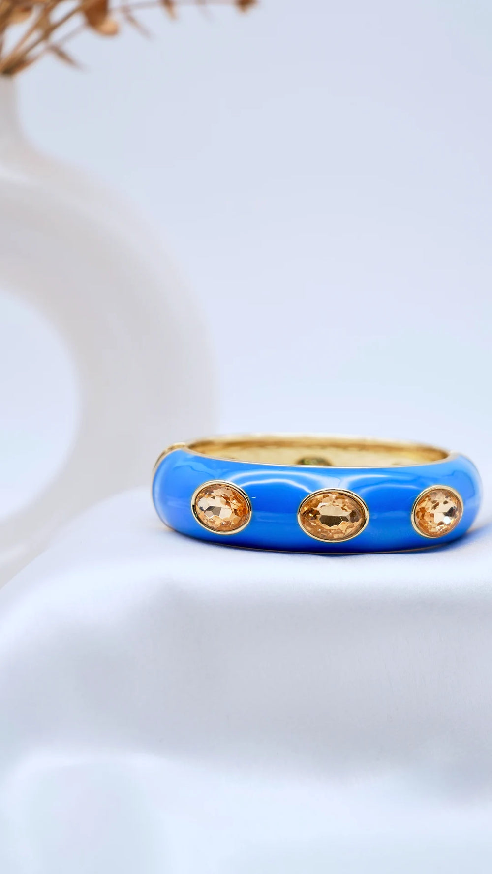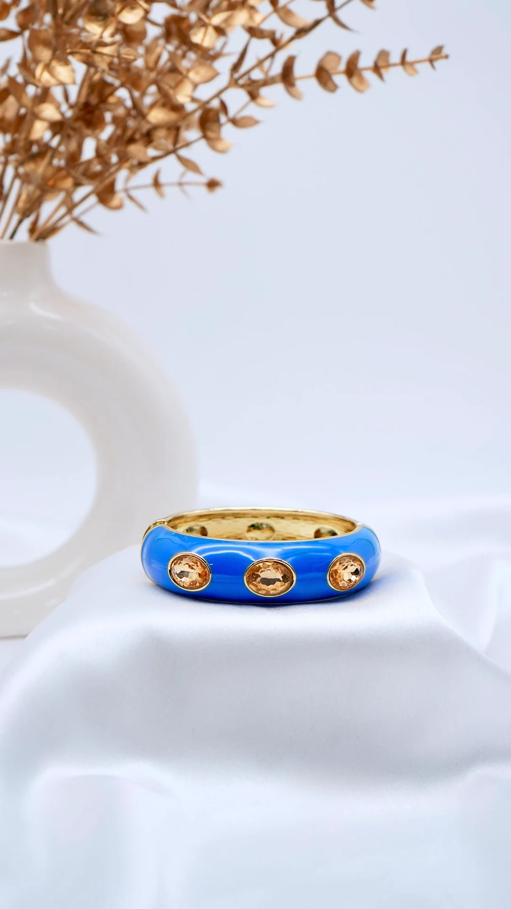 Celeneis a statement enamel bangle featuring evenly spaced crystal accents set against a high-gloss enamel base with gold-toned detailing. The structured silhouette adds a modern edge while remaining comfortable to wear. Available in two blue tones, it works effortlessly as a standalone piece or layered for everyday and occasion looks.