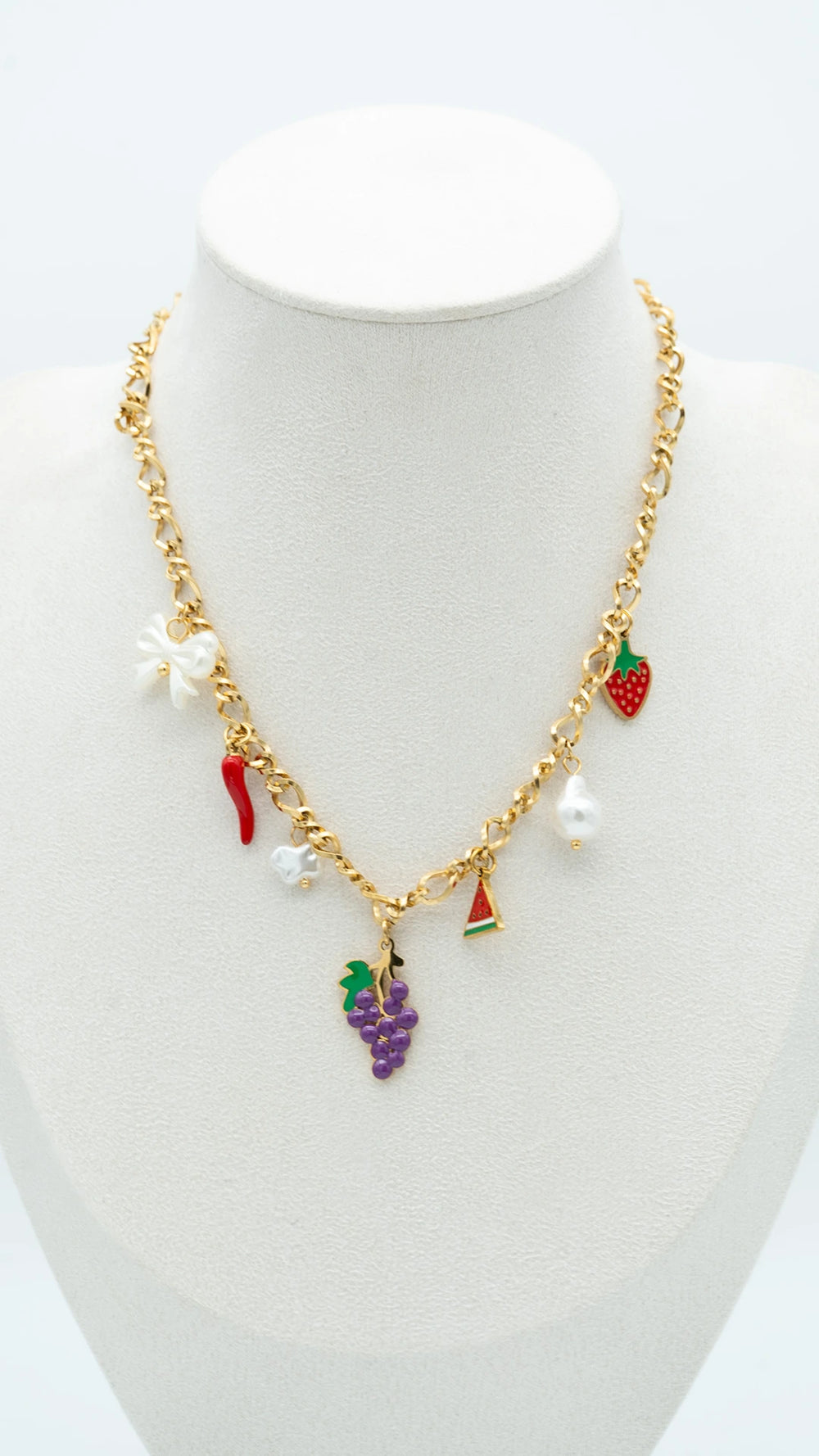 Say hello to playful luxury with the Charm Cart Necklace – a statement gold chain decked with a delightful mix of fruity and floral charms, including grapes, strawberry, watermelon slice, chili, pearls, and blossoms. This quirky yet elegant charm necklace is crafted from high-quality, anti-tarnish materials and is waterproof for everyday wear. Perfect for those who love dopamine dressing and Y2K-inspired jewellery, it's a must-have accessory to elevate your summer outfits, brunch looks, and holiday fits. Add a splash of color, character, and trend-forward energy to your jewellery collection with this vibrant charm cart of fun!