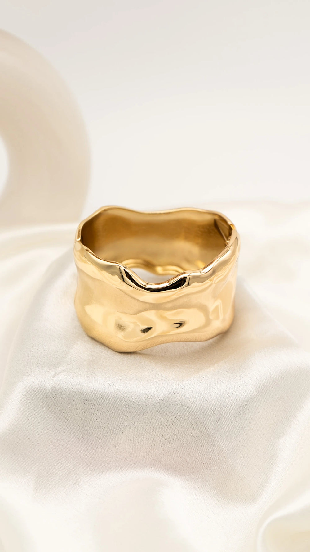 Bold yet fluid, the Gold Wave Melt bangle blends sculptural artistry with a molten gold finish. Its wavy, organic form mimics the flow of liquid metal, giving it a captivating, high-fashion edge. Designed to stand out, it adds instant drama whether worn alone or stacked with other pieces.