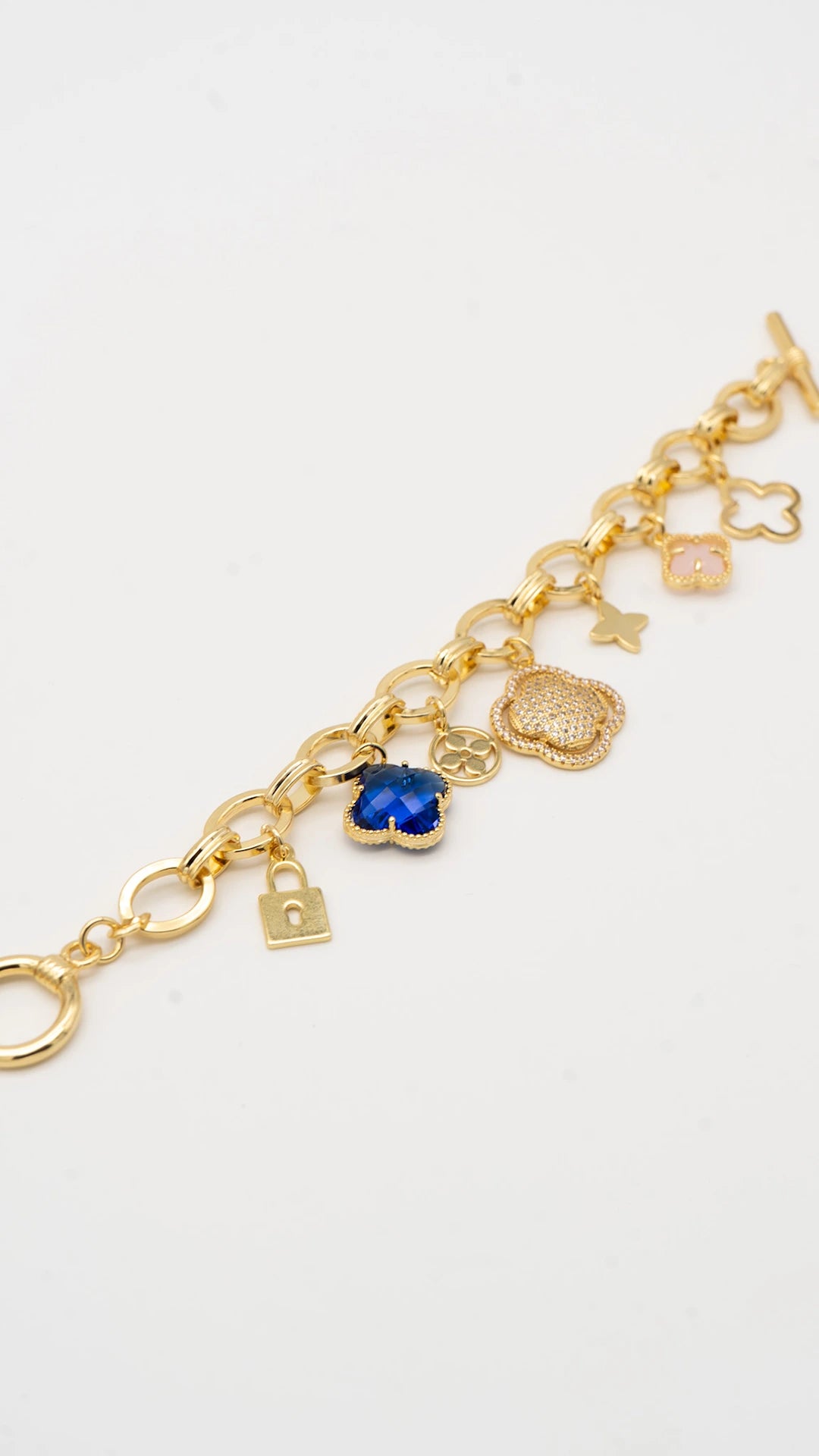 The Aurielle Bracelet is where timeless grace meets modern elegance and ultra high quality. Crafted with a bold gold link chain and adorned with a curated set of luxe charms — from deep sapphire tones to glimmering pavé motifs — this bracelet exudes quiet opulence. Perfect for both power brunches and evening soirées, it’s a piece that speaks of stories, style, and sophistication. Anti-tarnish and built to shine season after season.