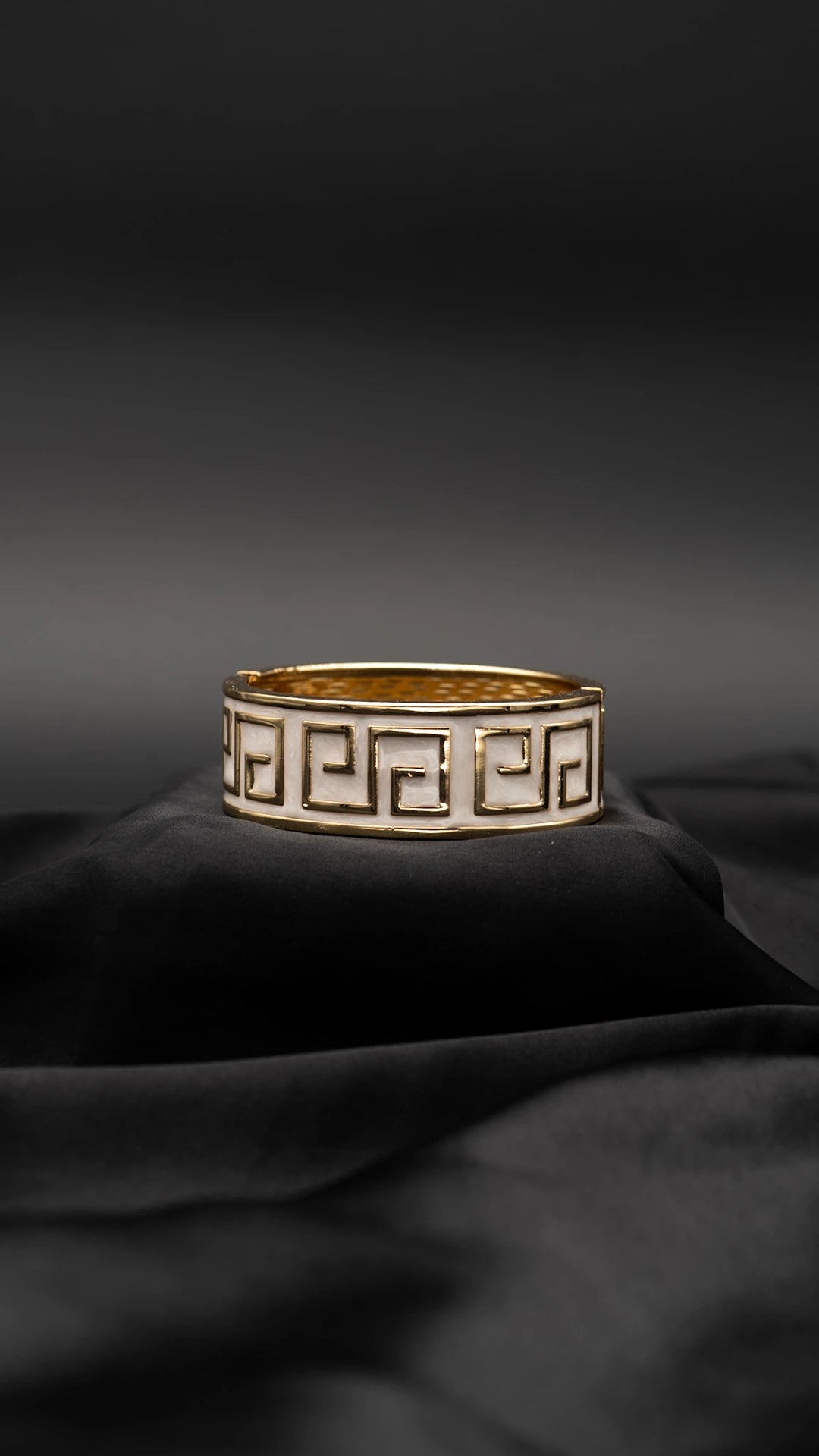 A modern classic reimagined in soft white enamel with a radiant gold Greek key design, the Elaia Glow Bangle captures understated elegance with a luminous twist. Its refined geometry and polished finish make it a perfect statement for both minimal and festive looks.