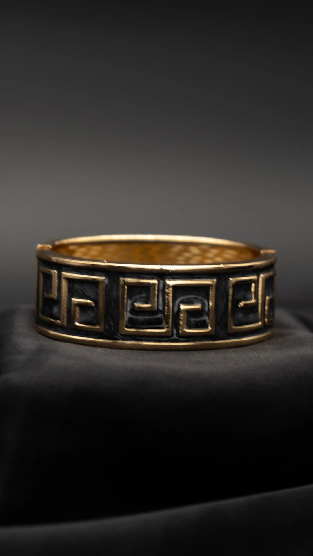 Bold and refined, the Elaia Charcoal Bangle draws from Grecian geometry with its signature maze pattern carved into rich black enamel. Framed in radiant gold, this piece brings timeless strength and elegance to modern styling.