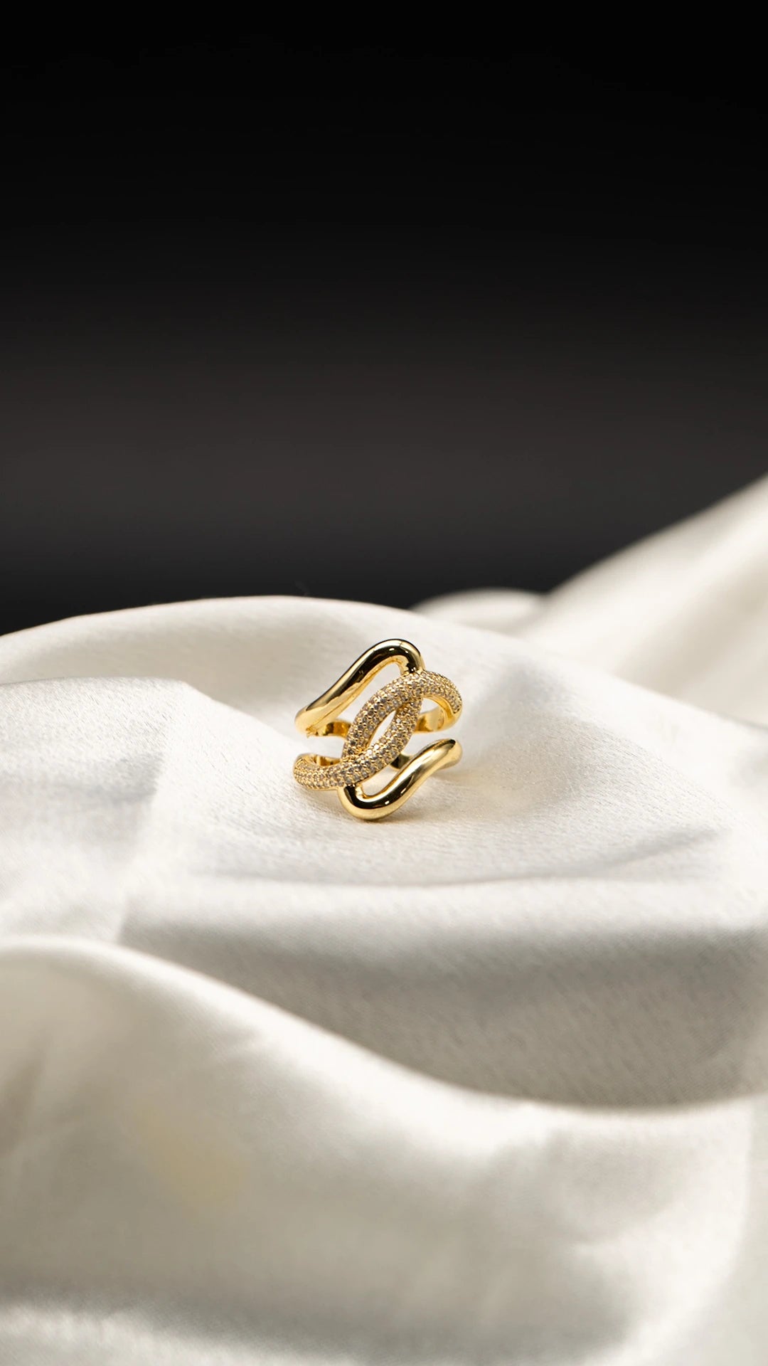 The Wavelet Ring captures the rhythm of modern elegance with its flowing, sculptural curves and a central pavé-studded link that shimmers with every movement. Crafted in a radiant gold finish, this piece blends softness and sparkle, evoking the beauty of ocean waves and golden light. Lightweight yet bold, it's designed for effortless statement styling—whether worn solo or stacked with your favorites. With its anti-tarnish, skin-friendly design, the Wavelet Ring brings a touch of fluid glamour to any look.