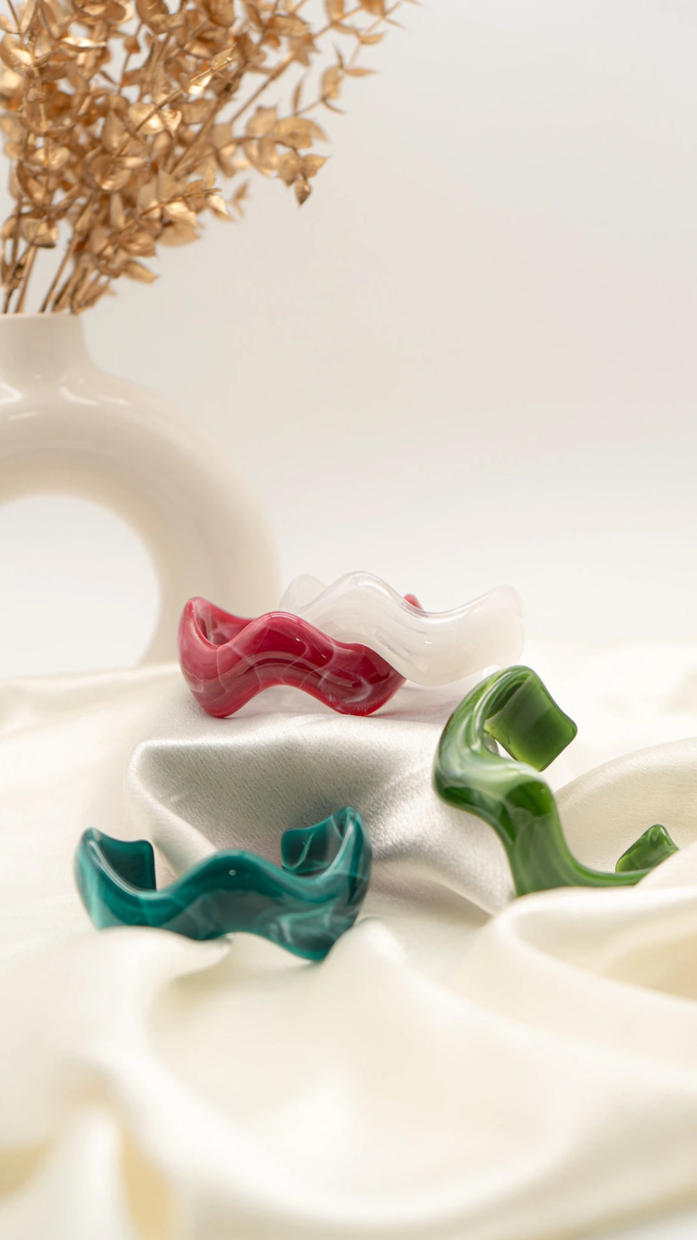 Elegant, luminous, and effortlessly timeless — the Pearl Swirl Resin Bangle is the perfect balance of minimal design and artistic flair. Its glossy white hue with delicate marbled swirls mimics the soft iridescence of natural pearls, while the sculptural wave silhouette adds a modern edge. Lightweight and versatile, it’s a go-to piece for both everyday elegance and special occasions.