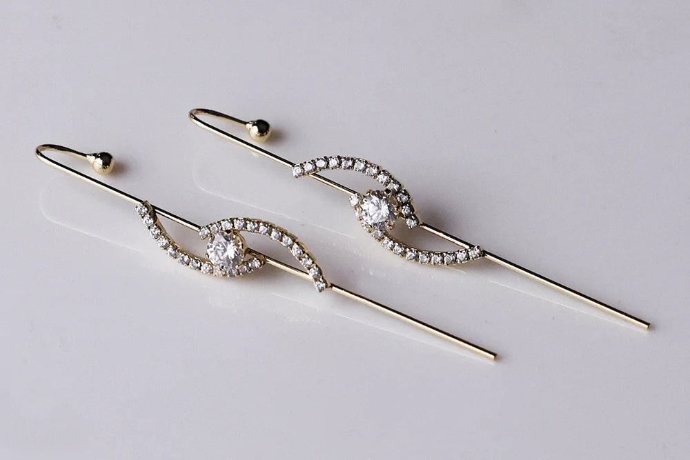 Experience Suav Jewels’ exclusive pin hook earrings – a chic accessory requiring just one piercing. Designed with a gold-tone finish and adorned with sparkling diamond-like stones, these high-quality earrings offer a luxurious, stylish look. Trendy and unique, they’re perfect for making a statement.