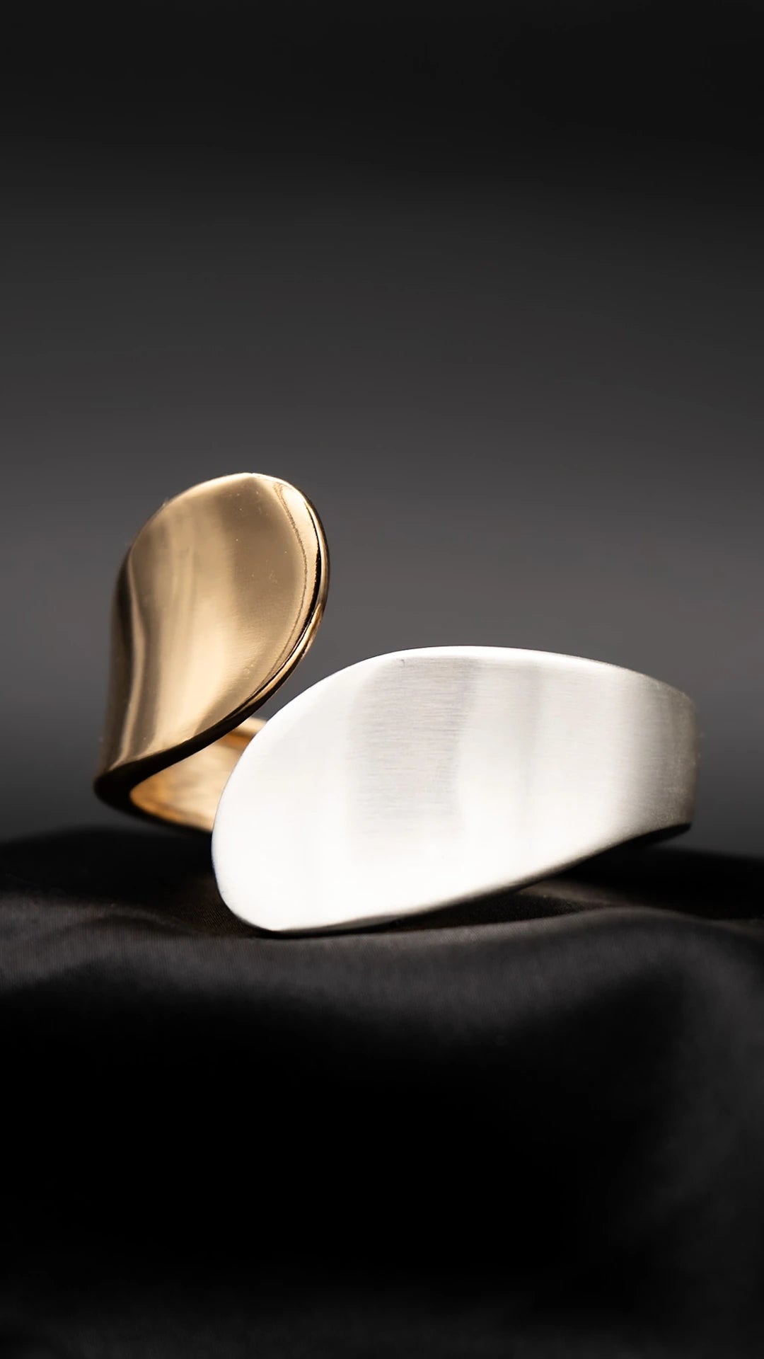 Minimal yet magnetic, the Twinlight Cuff Bangle plays with contrast in the most elegant way. Featuring a sculptural silhouette with one high-polish gold end and the other in brushed silver, this piece captures balance, light, and duality in a bold, wearable form.