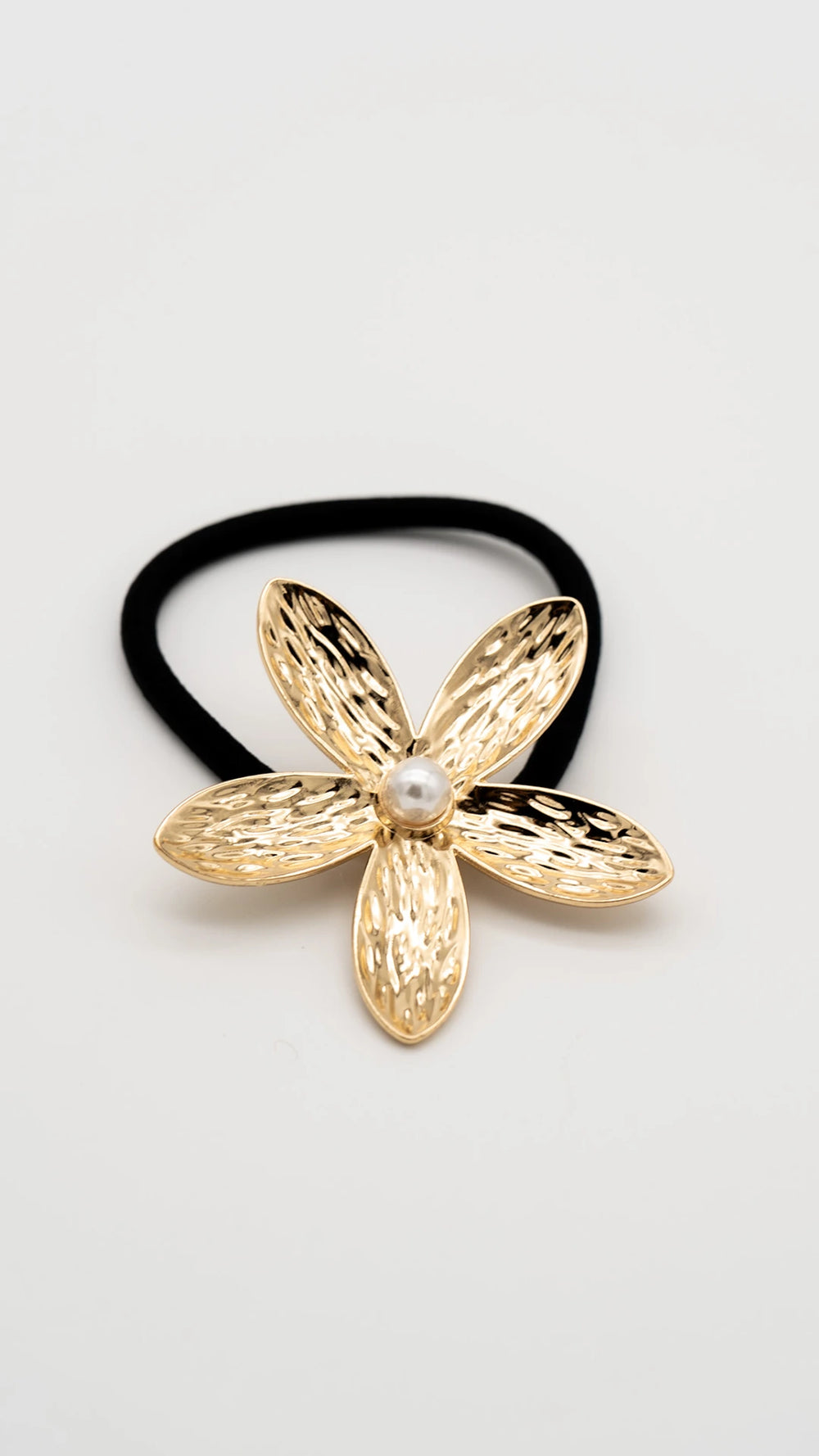 With its textured gold petals and a luminous pearl at the center, this hair tie brings a soft statement to your everyday or occasion looks.