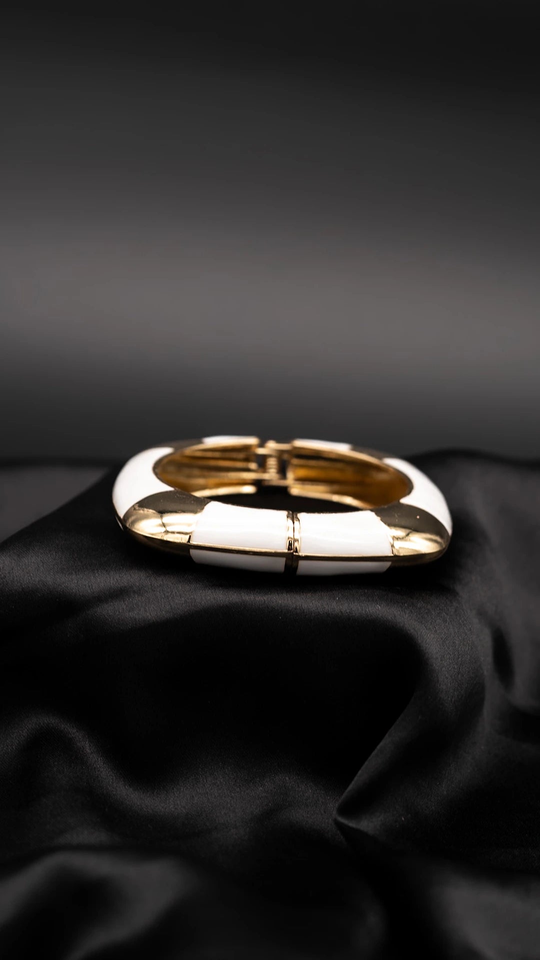 Chic and minimal, the Frosty Arc Bangle pairs icy elegance with bold structure. Featuring alternating glossy white enamel and polished gold arcs, this sculptural square bangle is the definition of cool-toned sophistication. Whether worn solo or stacked, it adds a clean, refined touch to any outfit.