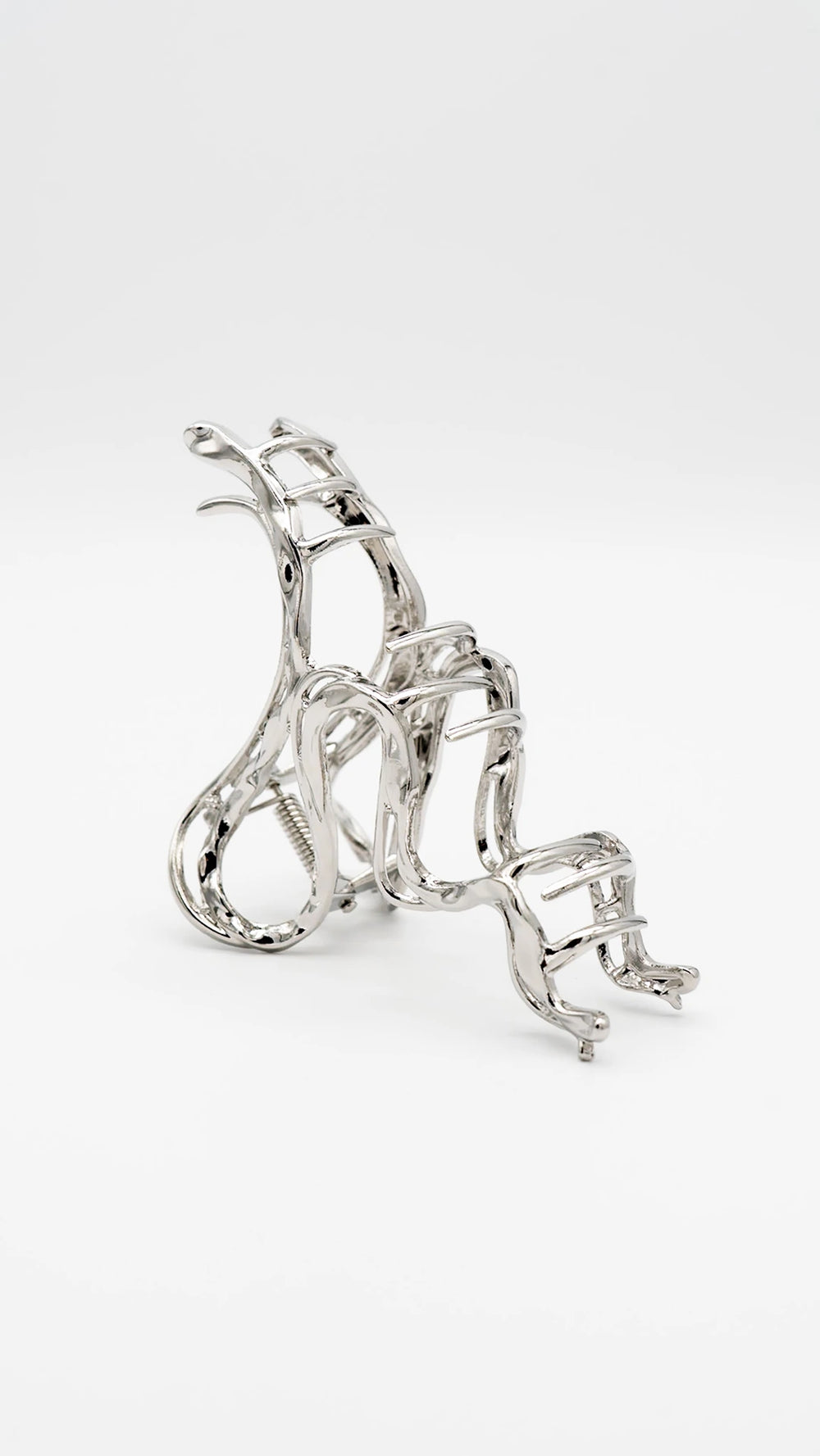 Sculptural and striking, the Celestia Flow hair claw captures the fluid grace of starlit waves. Crafted in a gleaming silver finish, its molten silhouette flows like liquid metal—perfect for adding a futuristic yet elegant touch to your hairstyle. Lightweight yet sturdy, it’s designed to secure your bun or twist with effortless flair.
