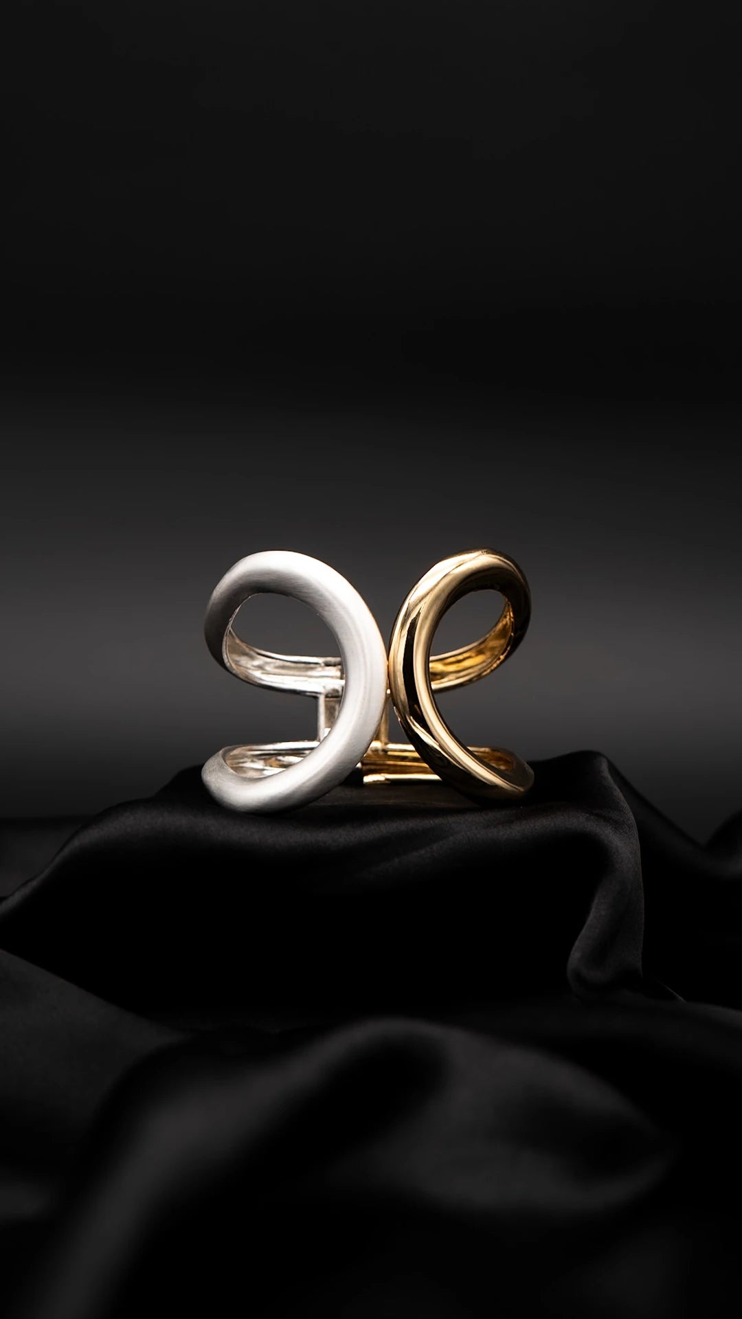 Sculptural and striking, the Celest Fold Cuff merges cosmic elegance with bold design. Featuring fluid, orbital curves in contrasting silver and gold tones, this open cuff wraps your wrist like a celestial wave — luminous, modern, and effortlessly powerful.