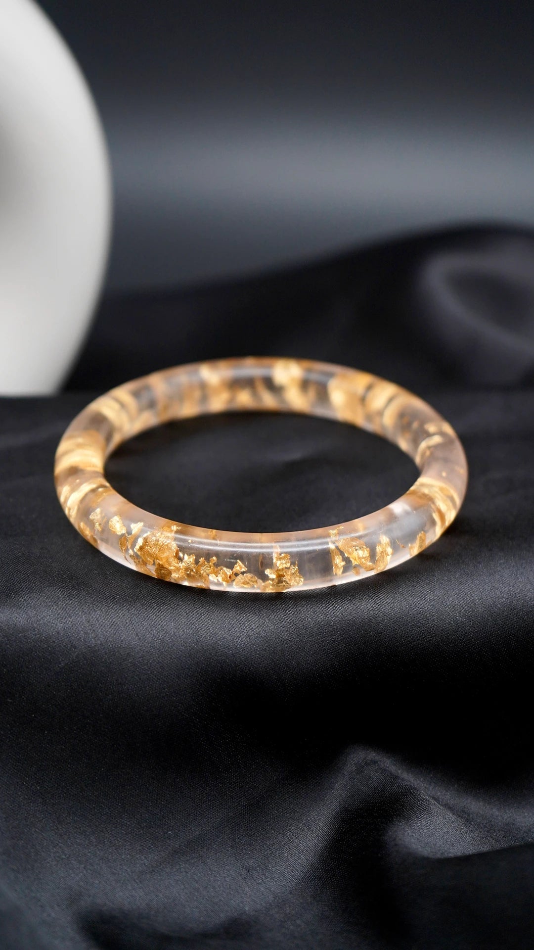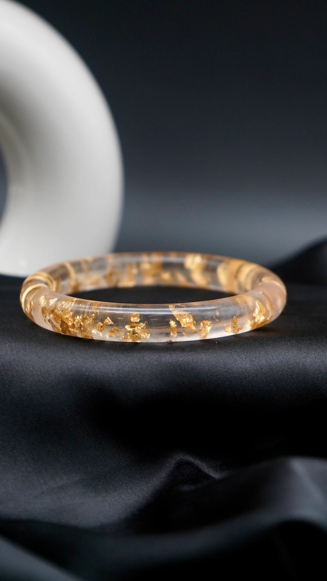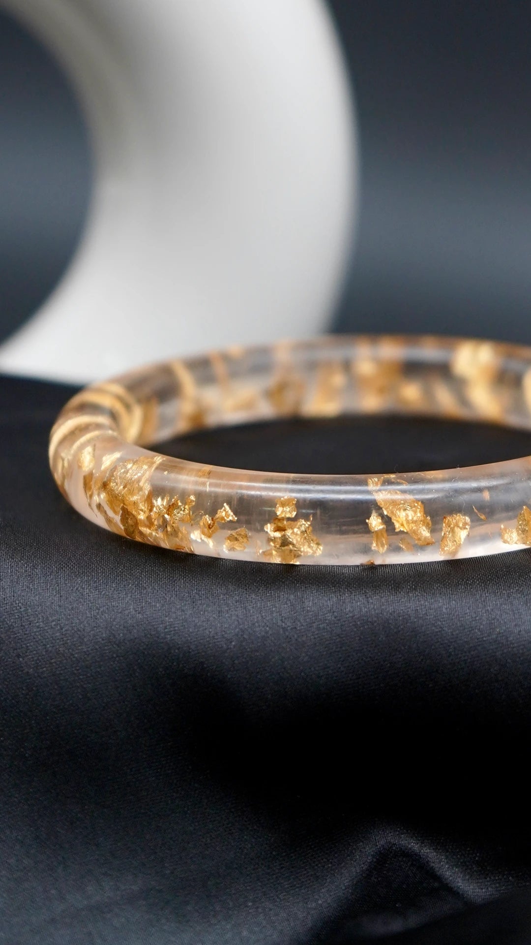 Sleek, radiant, and timeless — the Golden Line Resin Bangle captures effortless sophistication in its purest form. Crafted from clear, polished resin infused with delicate gold flakes, it reflects light with every movement, creating a luminous shimmer that feels both modern and ethereal. The slim, rounded shape adds a refined touch, perfect for everyday elegance or evening glamour.
