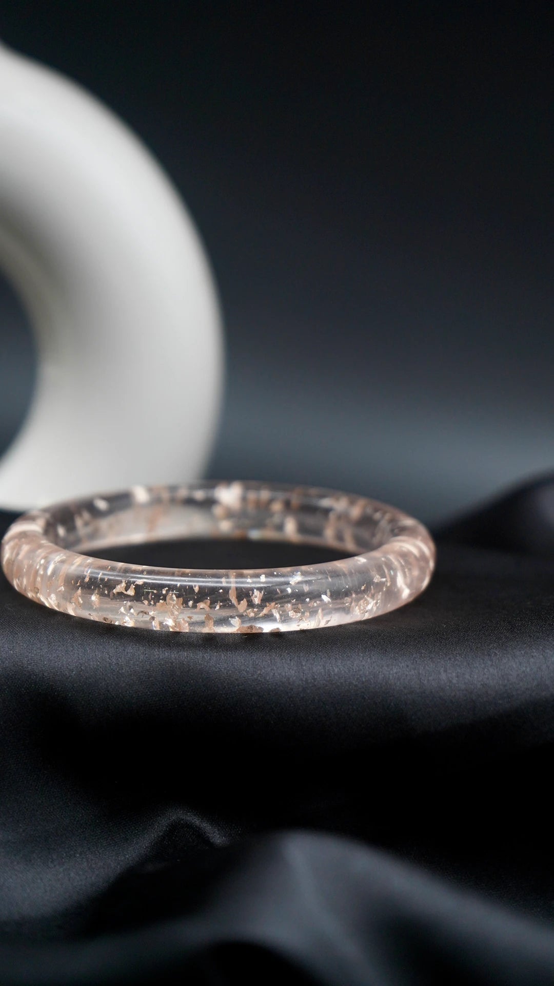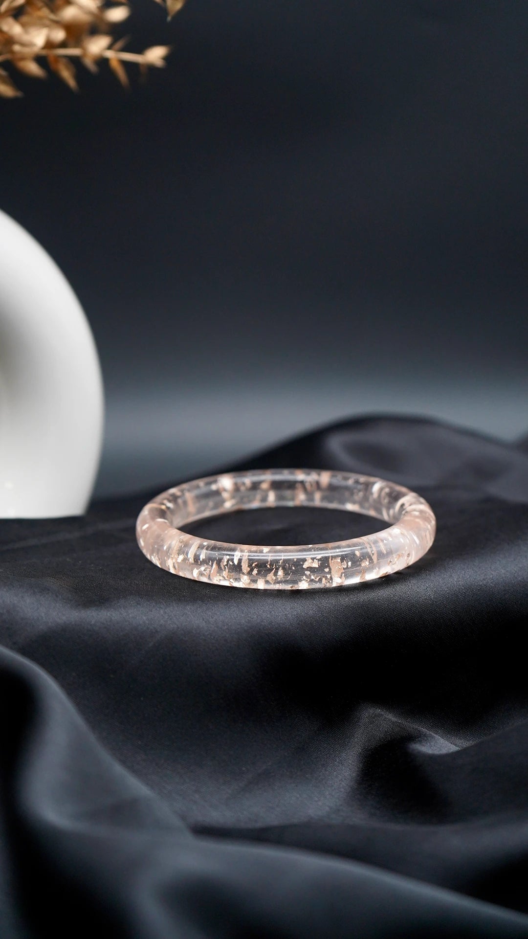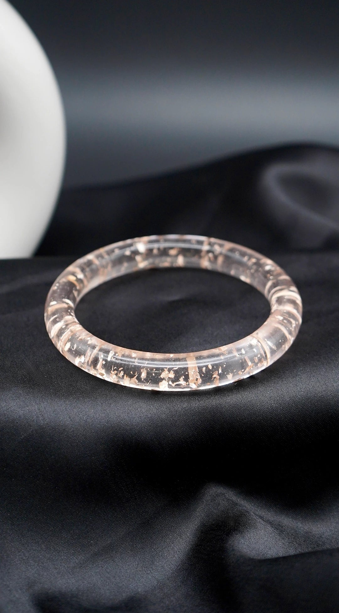 Delicate, luminous, and gracefully modern — the Rosé Line Resin Bangle captures the charm of soft blush tones with a touch of golden elegance. Crafted from translucent rose-hued resin and infused with fine gold accents, it glimmers beautifully in the light, creating an effortless statement of refined femininity. Its slim, rounded silhouette makes it a versatile piece that complements everything from minimal neutrals to evening glam.