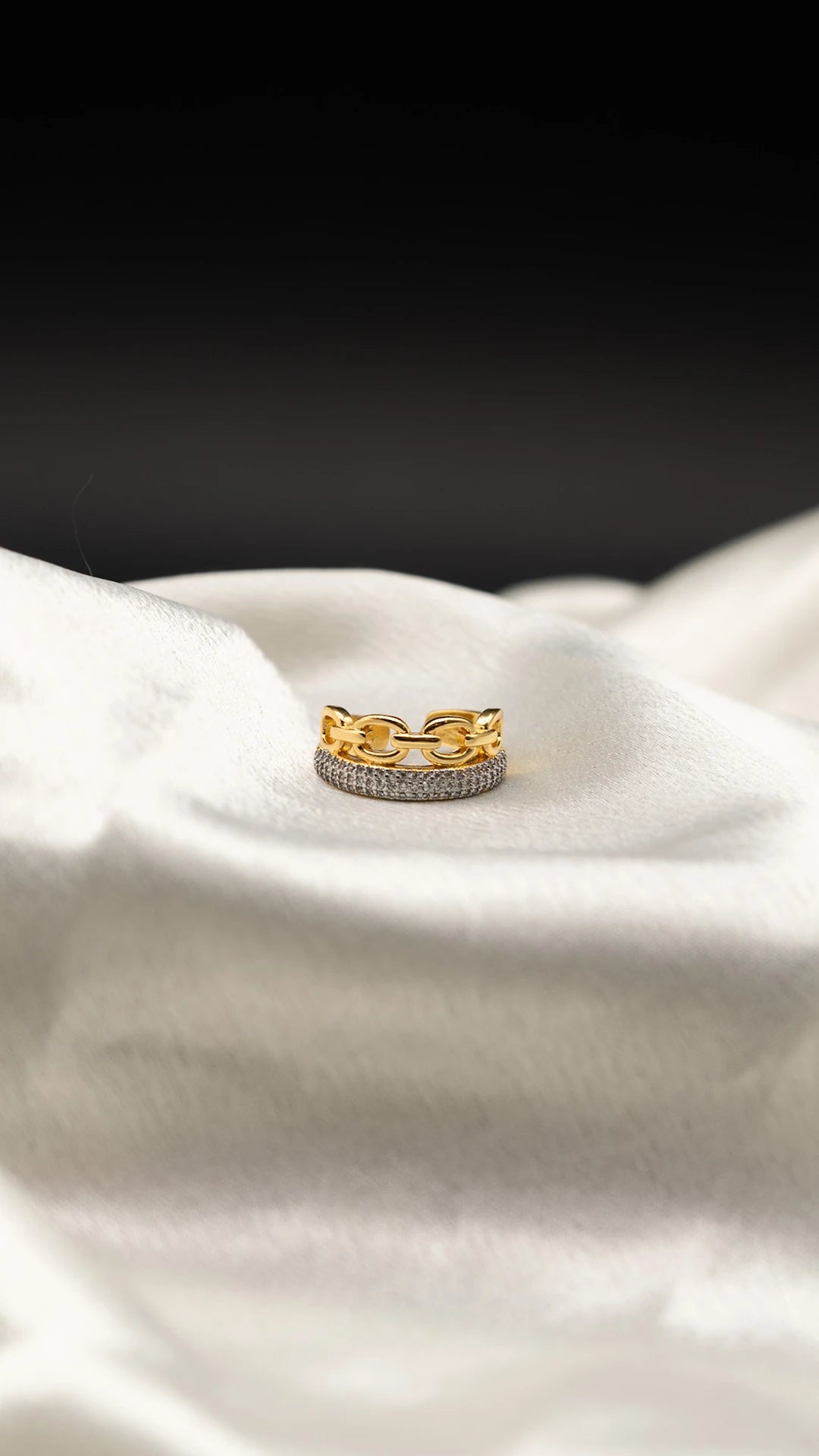 The Gleam ring is where modern boldness meets timeless shine. With a striking gold chain-link design layered above a band of shimmering pavé crystals, this piece brings texture, brilliance, and edge into perfect harmony. It’s a statement of strength and sophistication—crafted with a premium anti-tarnish finish and skin-friendly materials for all-day comfort. Whether worn solo or stacked, Gleam adds that effortless flash of confidence to every look.