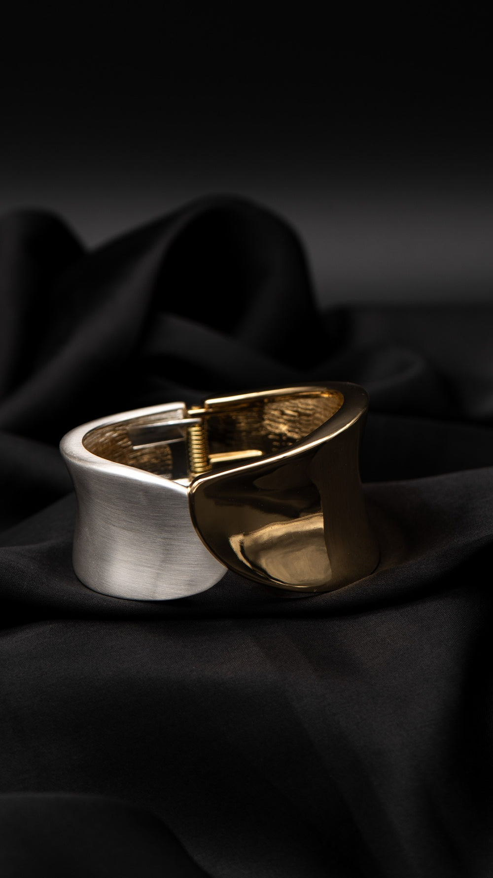 Striking, sculptural, and unapologetically bold — the Lyssa Curve Bangle is where modern art meets high fashion. Featuring an elegant fusion of brushed silver and polished gold tones, its fluid silhouette wraps around your wrist with effortless sophistication. Designed for the fearless, this piece turns minimalism into a moment. Made with anti-tarnish, waterproof materials, Lyssa Curve is built to shine through seasons, trends, and every standout look.