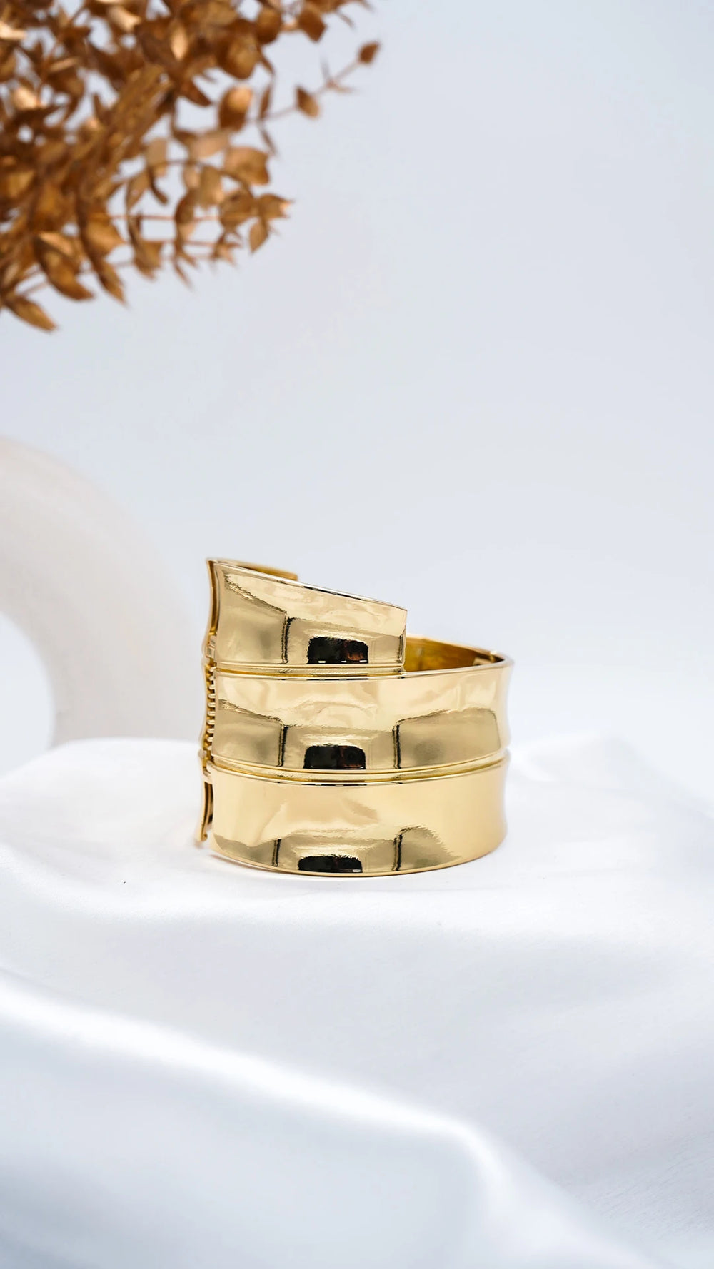 Dramatic and artful, the Helix Bangle is a sculptural masterpiece that wraps around the wrist in bold, golden layers. With its twisted, spiral silhouette and reflective high-shine finish, this statement piece is designed to turn heads — equal parts architectural and luxurious.