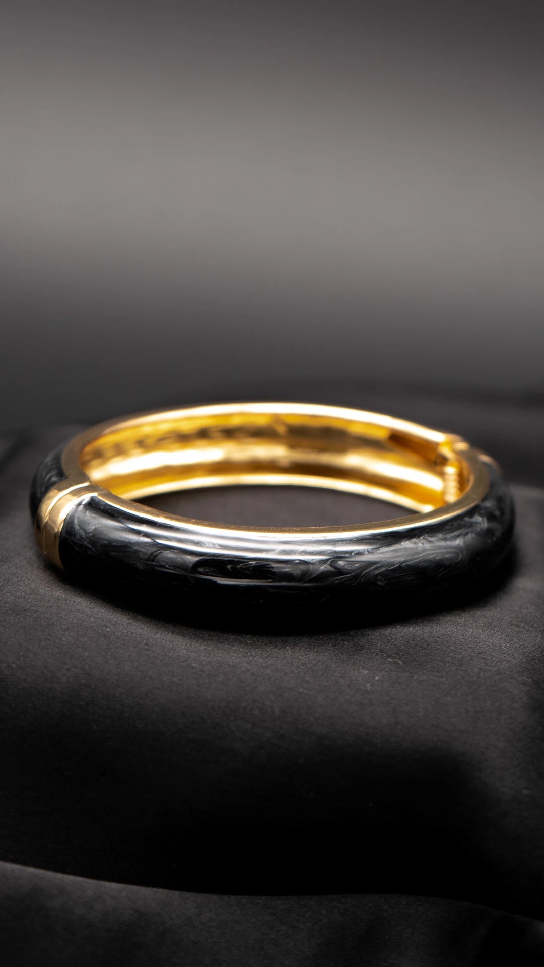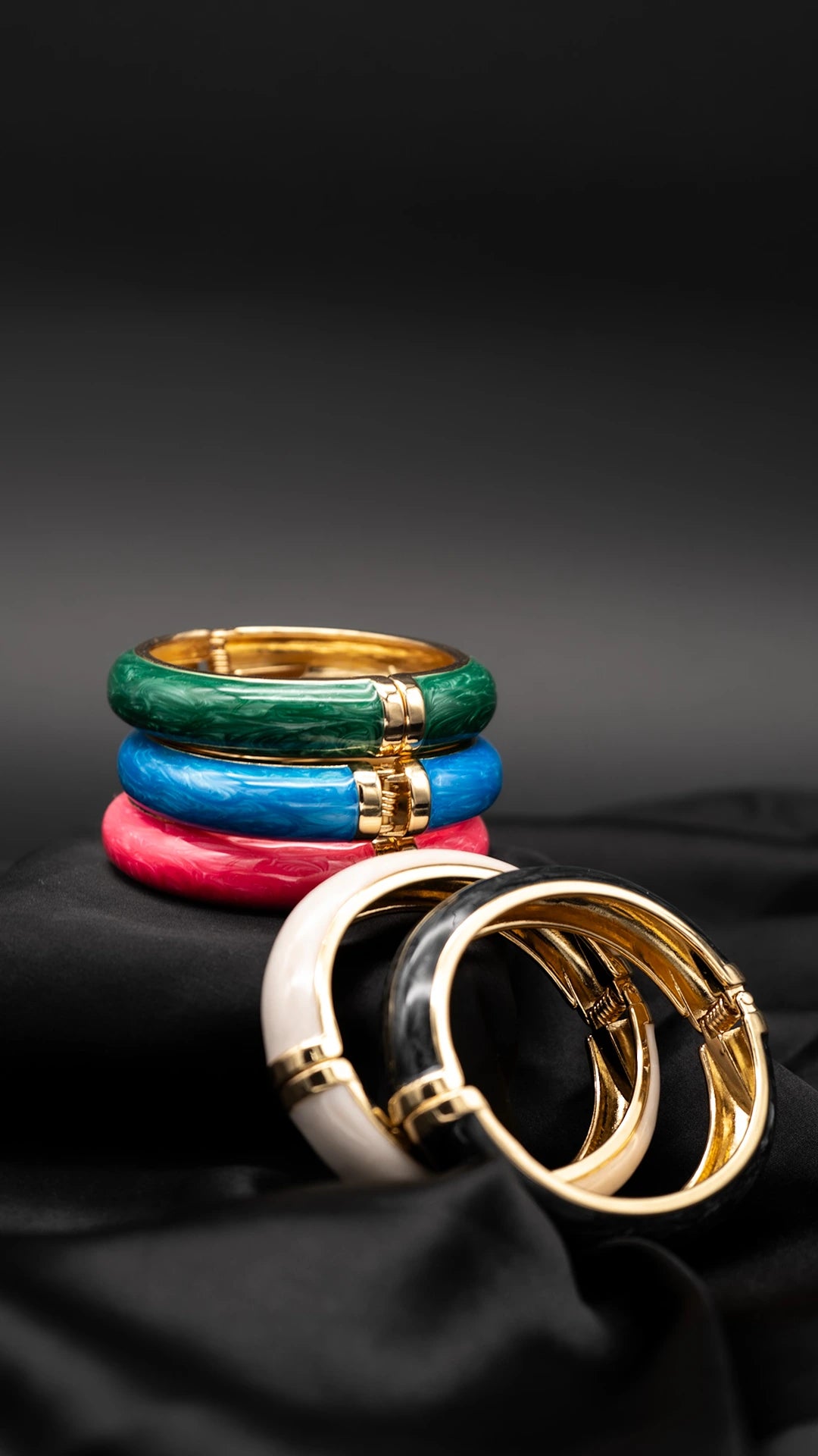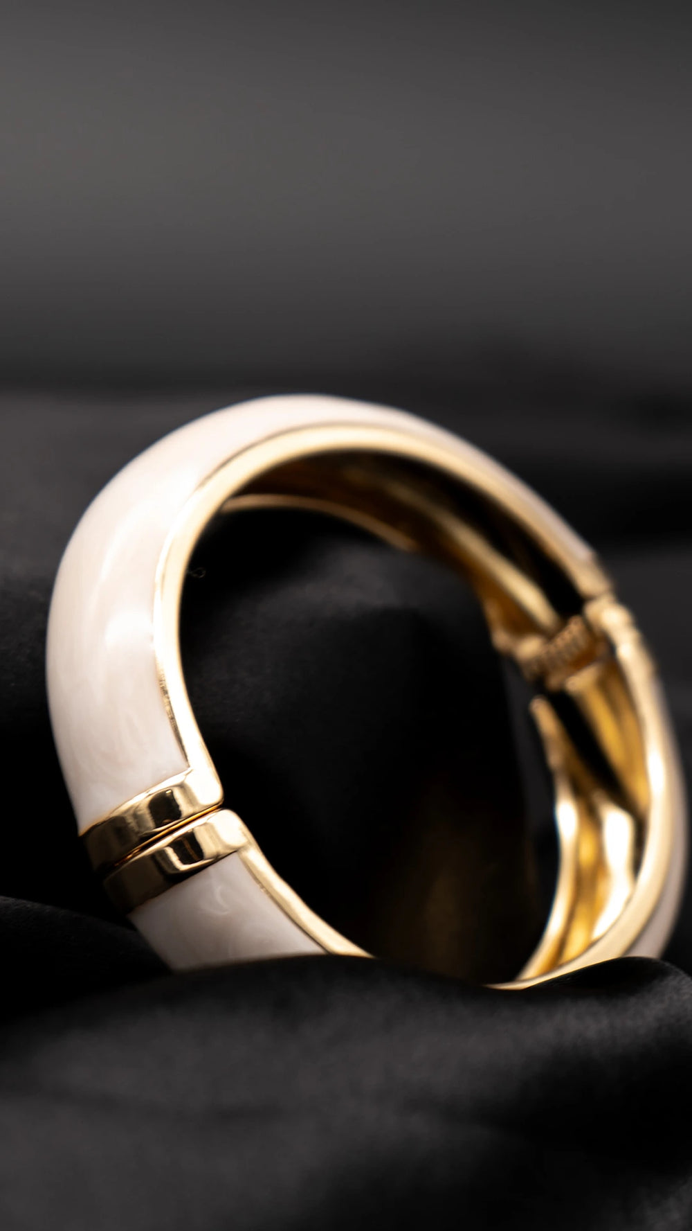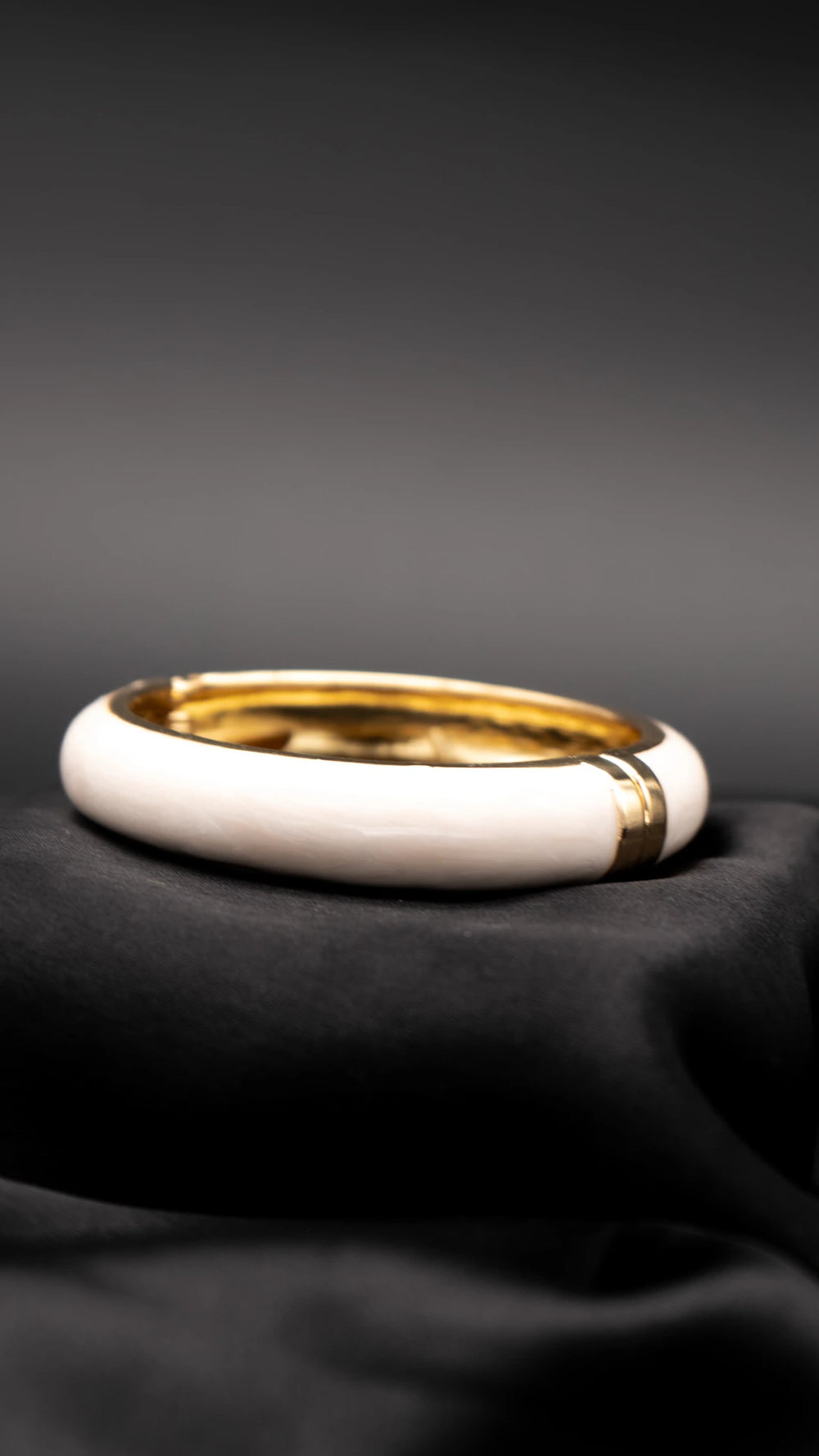 Smooth and radiant, the Evara Bangle embodies timeless minimalism with a sculptural twist. Its seamless, rounded form is coated in a glossy enamel finish, giving it a sleek and polished look. The subtle metallic edges add a hint of refinement, while the secure hinge closure ensures effortless wear. Whether styled solo or layered, Evara is the perfect blend of softness and strength.
