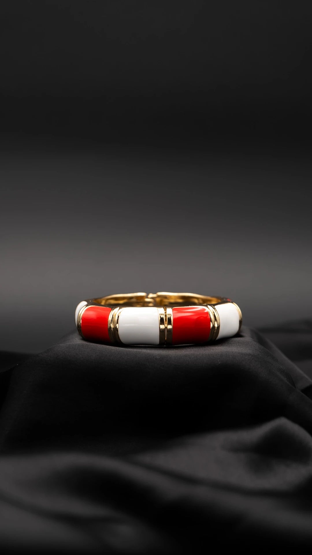 Striking and sophisticated, the Ira Red Bangle is your go-to statement piece for bold styling with a playful twist. Featuring alternating red and crisp white enamel panels, framed in glossy gold, this bangle fuses classic charm with a fresh, modern edge. Its chunky, curved silhouette is crafted from premium, tarnish-resistant materials that ensure long-lasting shine and comfort. Whether paired with festive outfits or sleek monochromes, this piece instantly elevates your look.