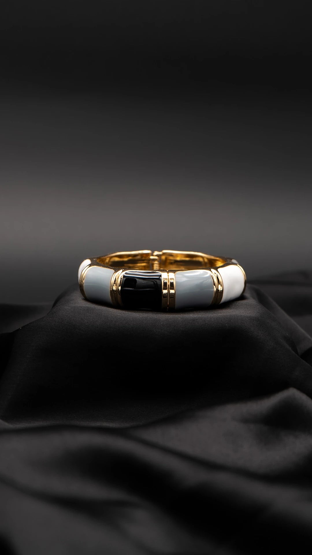 Where elegance meets edge — the Ira Monochrome Bangle is a sleek fusion of black, grey, and white enamel segments framed in radiant gold. This bold yet minimal piece captures the essence of quiet luxury with its clean palette and sculptural form. Designed for the modern muse, it transitions effortlessly from day to night, adding a refined statement to both casual and elevated looks. Made from premium, tarnish-resistant materials, it offers lasting shine and comfort.