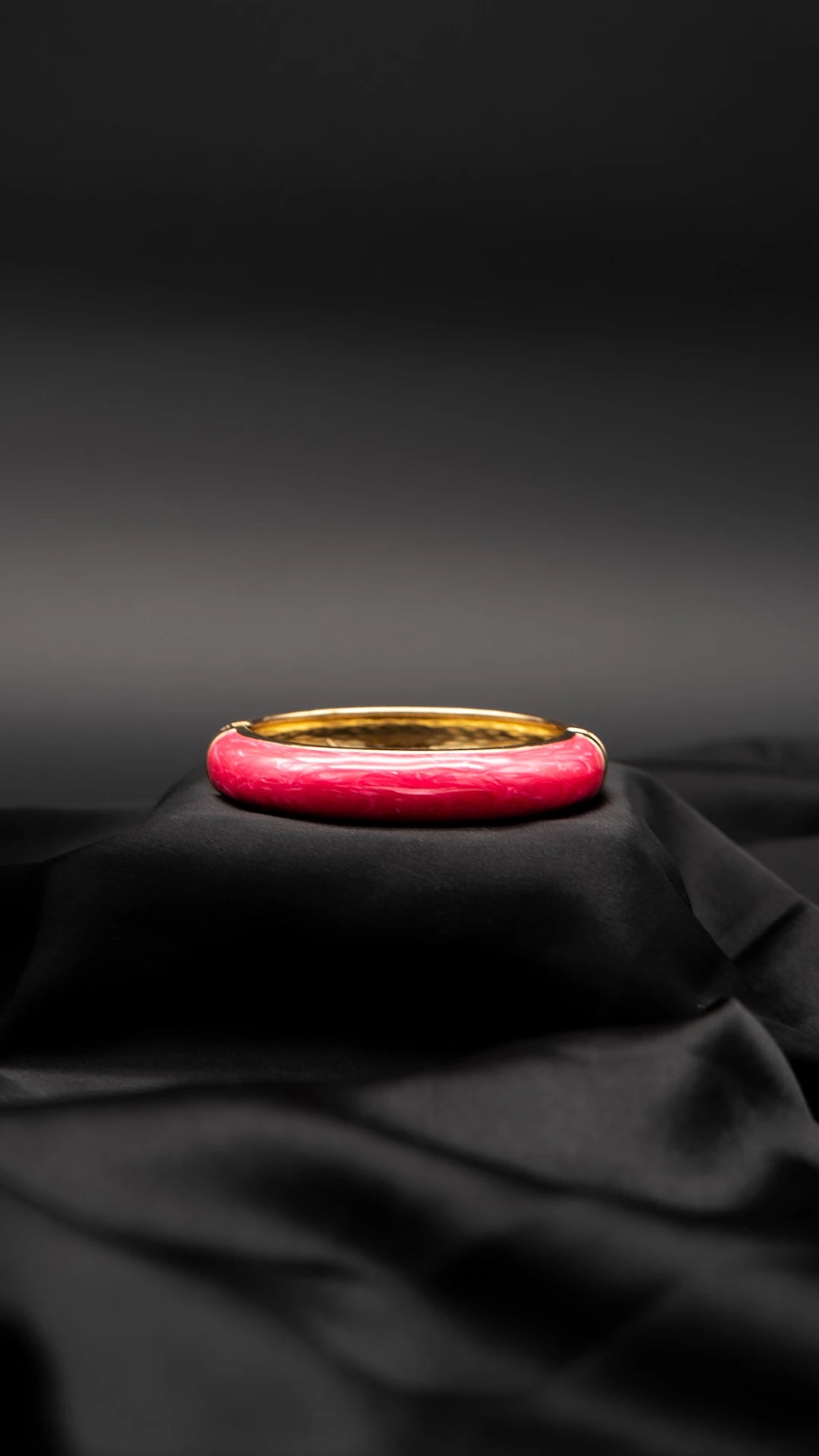 Radiating charm and confidence, the Evara Crush Bangle is a celebration of bold femininity and graceful design. With its lush pink enamel and delicate marbled texture, framed in a high-shine gold finish, this rounded bangle captures the essence of effortless beauty. Whether worn as a pop of color or layered into a statement stack, it’s crafted from premium tarnish-resistant materials that promise long-lasting shine and all-day comfort. A modern classic made to bloom with every look.