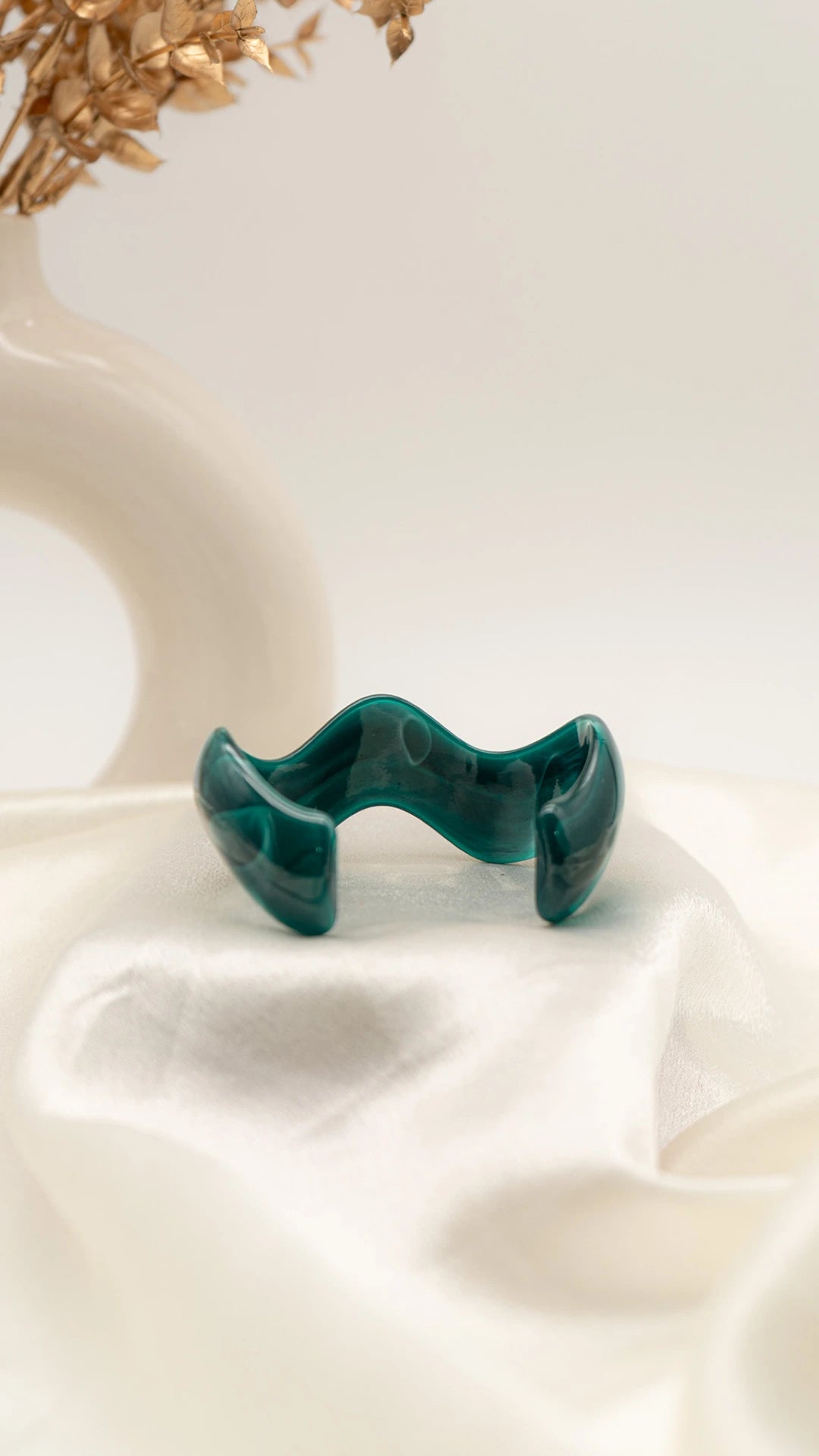 Lush, vibrant, and effortlessly striking — the Emerald Swirl Resin Bangle captures the beauty of gemstone tones in a modern, sculptural form. Its deep emerald hue is enriched with marbled swirls, creating a sense of movement that catches the light from every angle. The wavy silhouette adds an artistic edge, making it the perfect statement piece for both casual and dressy looks.