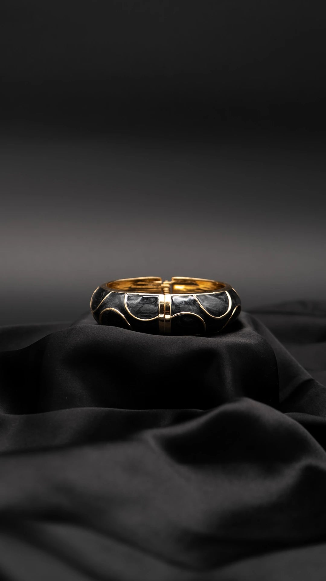 Striking and sculptural, the Luna Black Bangle is where modern elegance meets artistic boldness. Featuring rich black enamel swirled into crescent-like curves framed in gold, it brings a luxurious edge to your everyday or evening looks. A true statement piece that feels both contemporary and timeless.