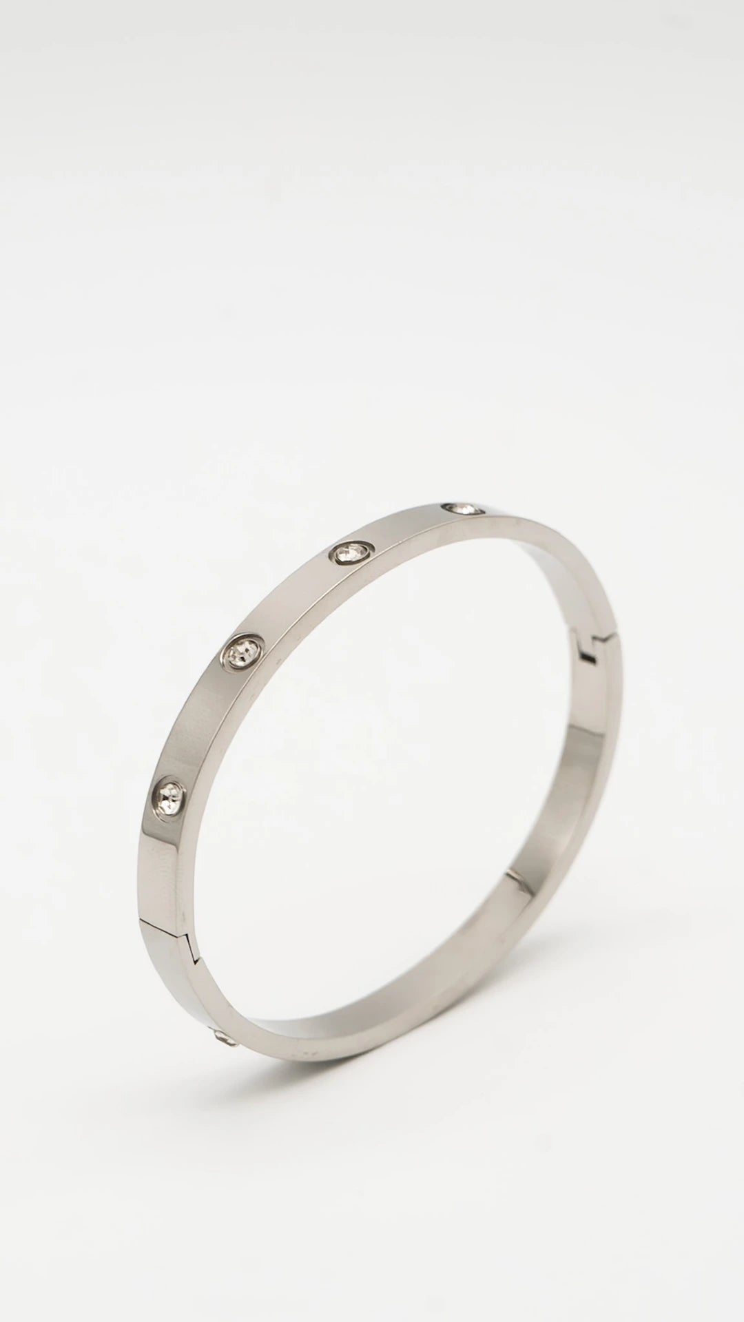 The Lustre Bangle is timeless sophistication wrapped in a sleek silver finish. Designed with a minimalist silhouette and accented by evenly spaced crystal studs, this bangle delivers just the right touch of shimmer. Crafted from high-quality stainless steel with premium silver plating, it's anti-tarnish, hypoallergenic, and made to shine through everyday elegance or evening glam. A staple piece for those who love understated luxury with a polished edge.