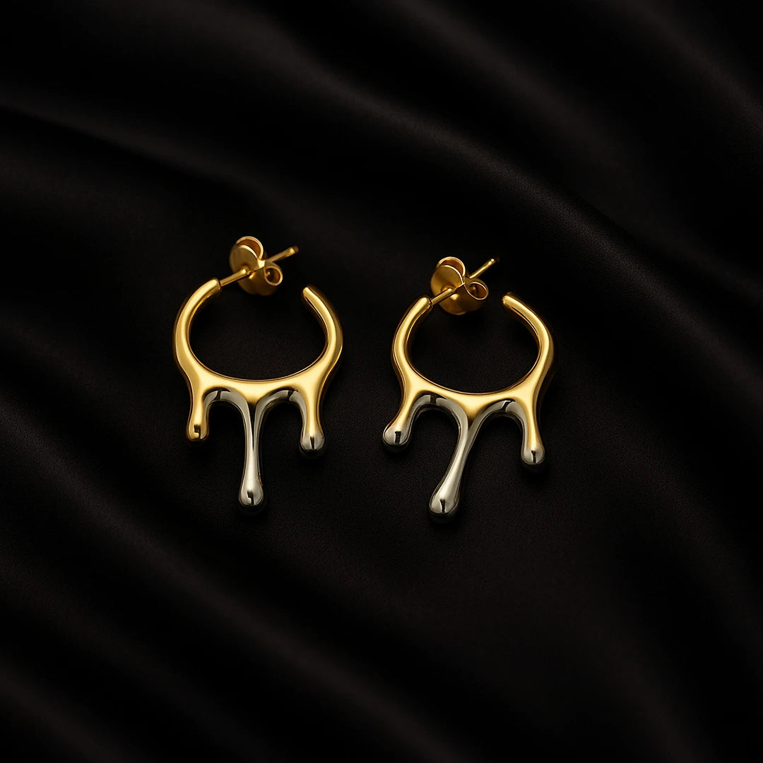 Art meets alchemy in the Molten Muse earrings — a sculptural blend of gold and silver tones that melt into fluid, drip-like curves. Bold yet wearable, these hoops are designed to turn heads with their liquid-like elegance. Waterproof, tarnish-free, and made for the modern muse who owns her glow.