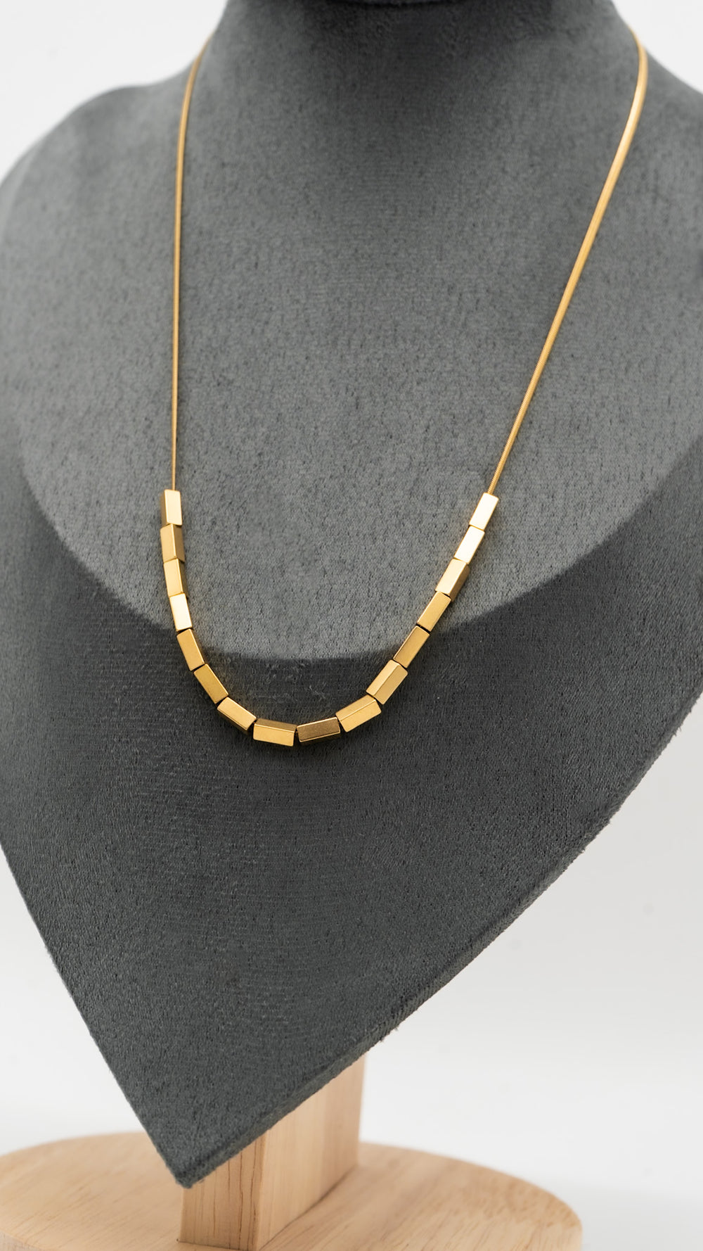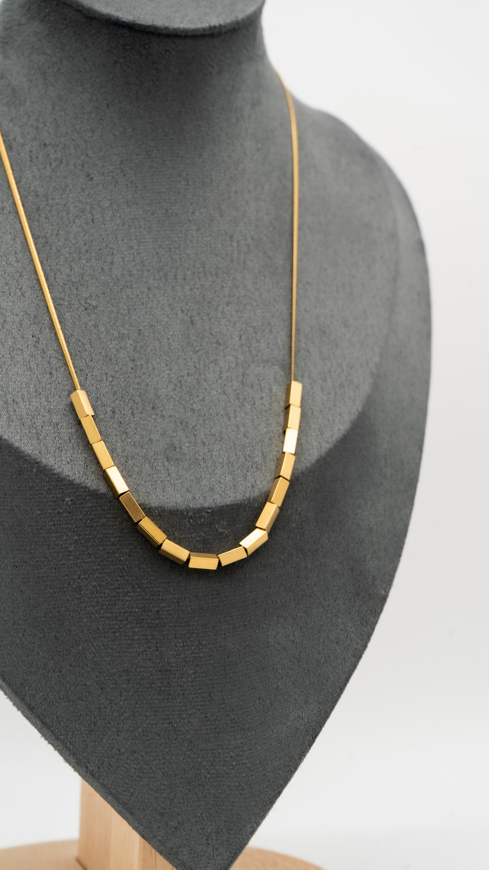 Bold in form yet minimal in essence, the Cubia Golden Link Necklace is a celebration of clean geometry and modern elegance. Featuring a sleek arrangement of gold-toned cuboid beads on a slender chain, this piece brings structure and shine to any look. Lightweight, anti-tarnish, and hypoallergenic — it’s perfect for everyday sophistication or effortless layering. Elevate your style with this sharp, contemporary classic.