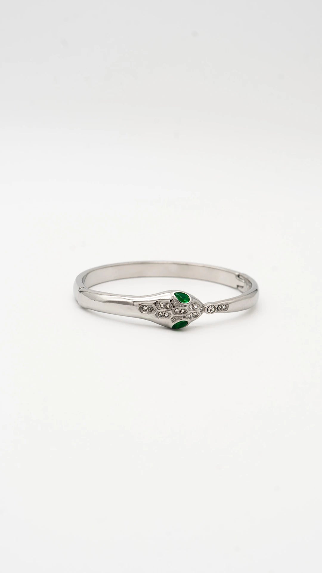 Channeling regal power and timeless allure, the Royal Serpent Silver Bangle features a sleek silver finish adorned with shimmering stones and deep green accents. Inspired by ancient empresses and serpent symbolism, it represents wisdom, strength, and elegance. Finished with premium silver plating, this bangle is anti-tarnish, hypoallergenic, and made to captivate at every glance.