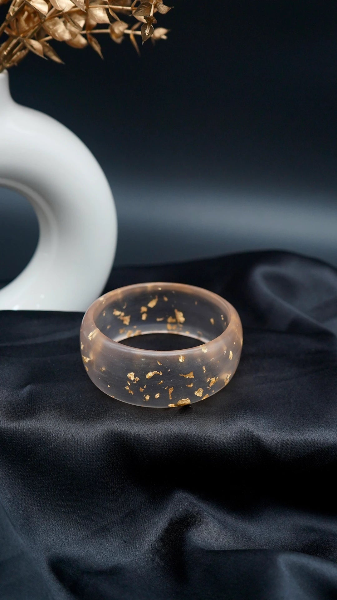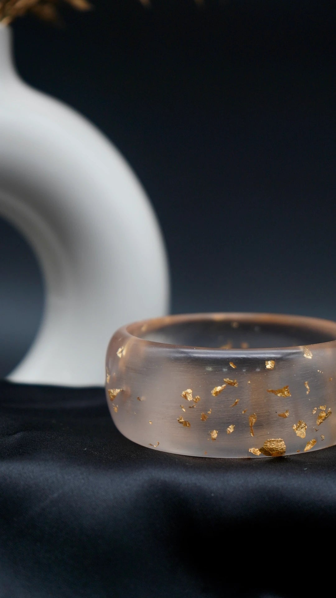 Delicate, dreamy, and luminous — the Golden Dust Resin Bangle captures the beauty of sunlight suspended in motion. Handcrafted from translucent blush-toned resin and infused with fine golden flakes, it glows with a soft radiance that shifts effortlessly with every movement. Its smooth, rounded shape makes it as comfortable as it is captivating.