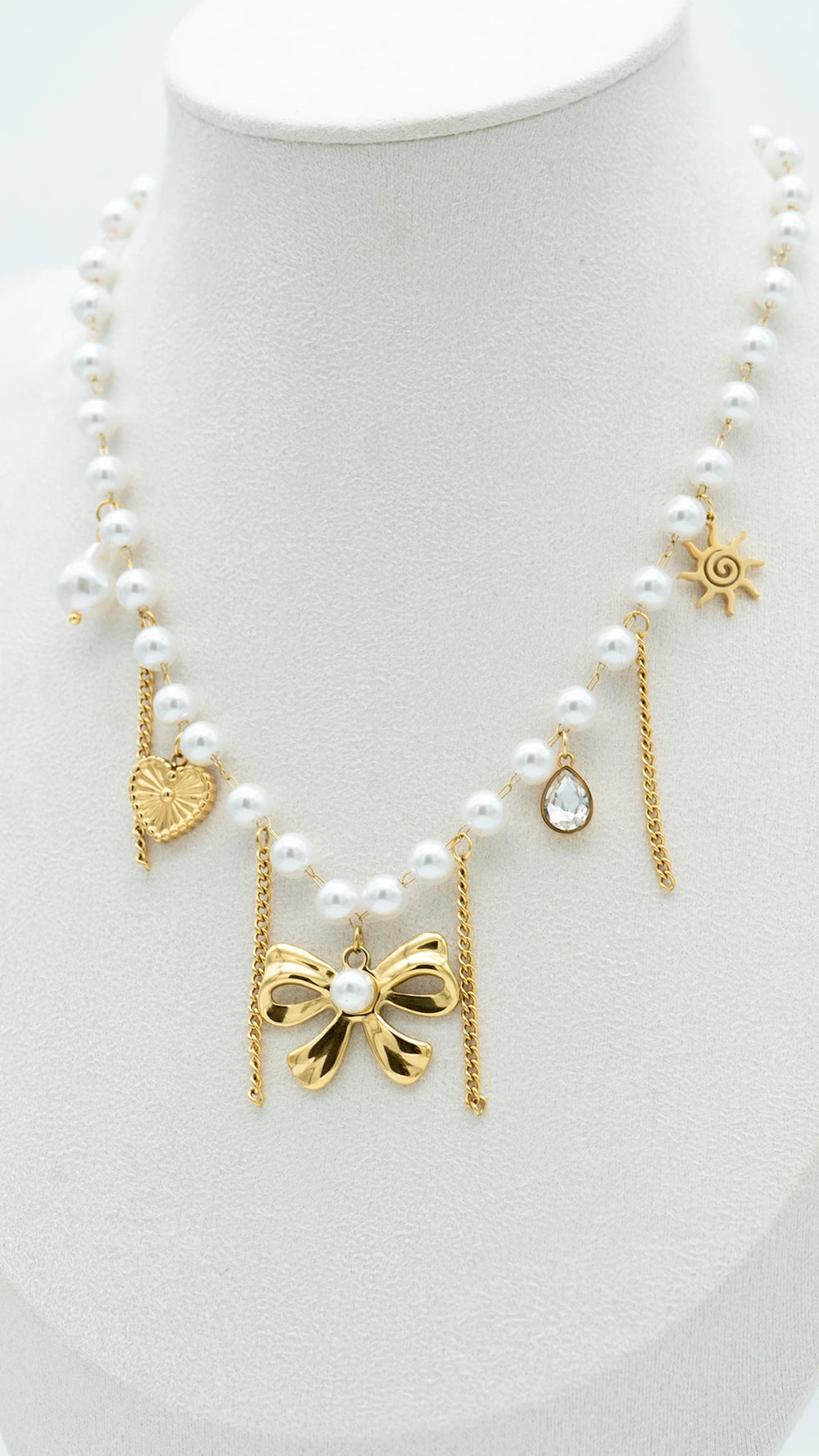 Elevate your elegance with the Pearl Poise necklace — a graceful blend of timeless pearls and delicate gold charms. Featuring a statement gold bow at its center, along with sun, heart, and crystal accents, this necklace embodies sophistication with a touch of whimsy. Each pearl is strung to perfection on a durable, anti-tarnish, waterproof base — ideal for everything from brunches to evening soirées. Whether layered or worn solo, Pearl Poise adds a refined sparkle to every outfit, making it a staple in your luxe jewellery collection.