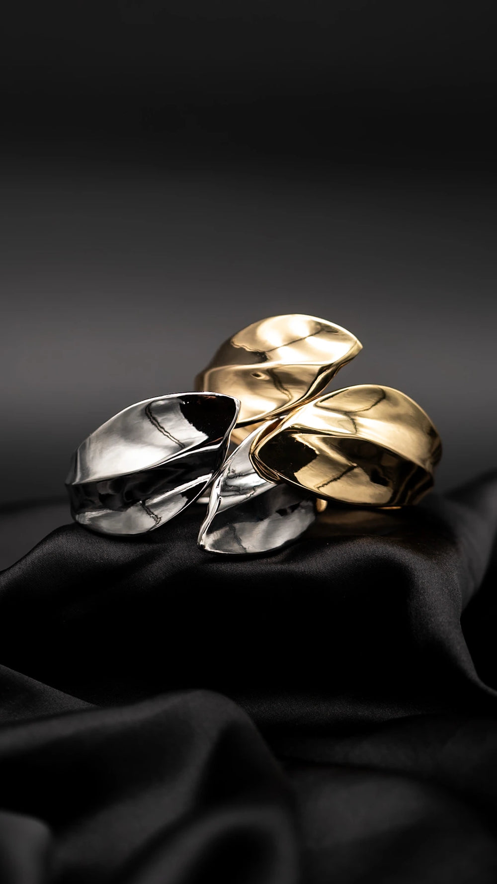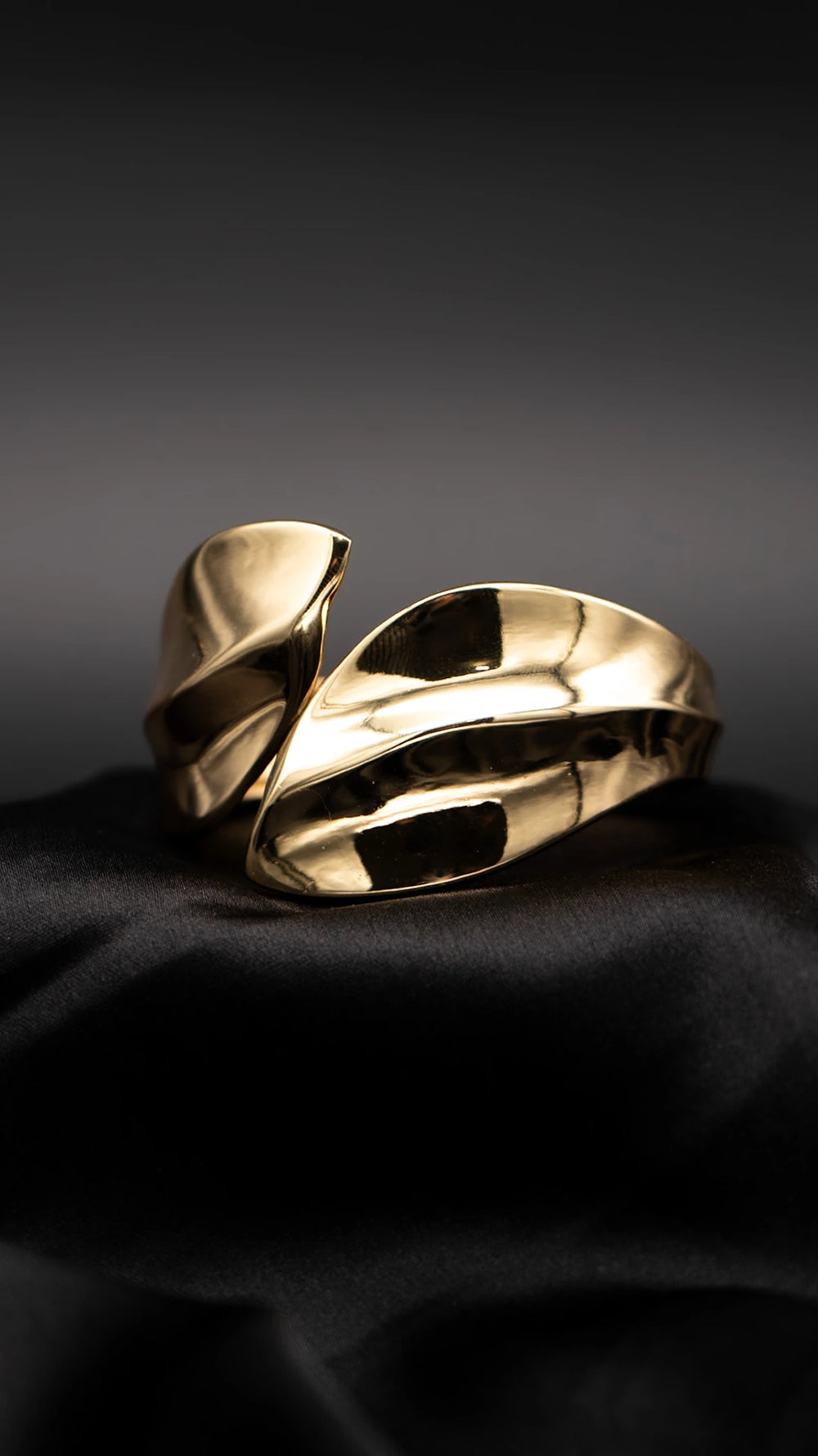 • High-polish gold surface with sculptural folded form