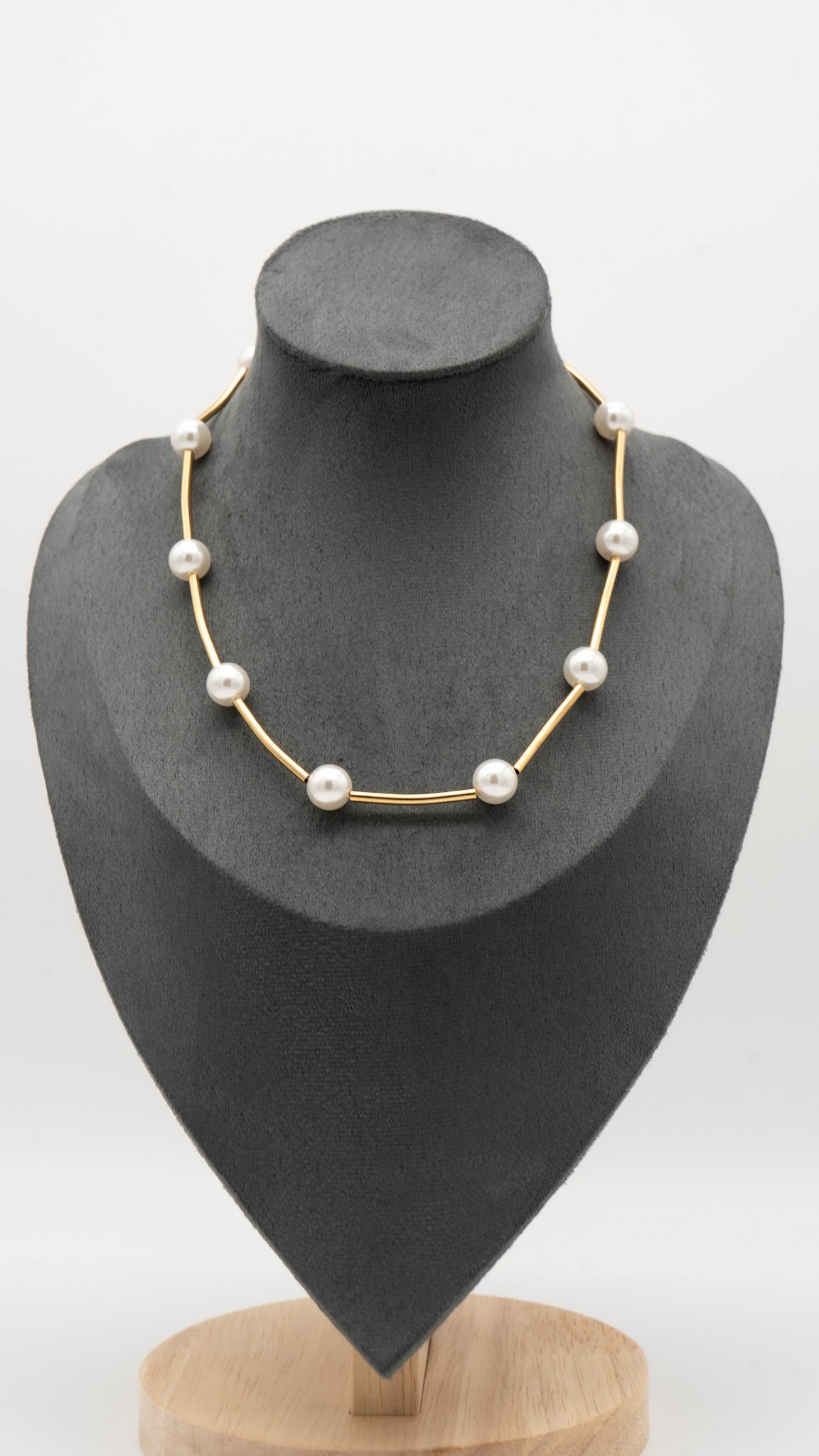 Inspired by the gentle rhythm of ocean waves, the Gleaming Tide Necklace captures elegance in motion. Lustrous pearls are spaced along sleek gold bars, creating a fluid silhouette that feels both timeless and contemporary. Crafted with ultra high-quality, tarnish-resistant materials, this piece is perfect for adding soft sophistication to any look. Whether paired with a crisp shirt or a flowing dress, it moves with you — like light on water. Classic, calm, and endlessly beautiful.