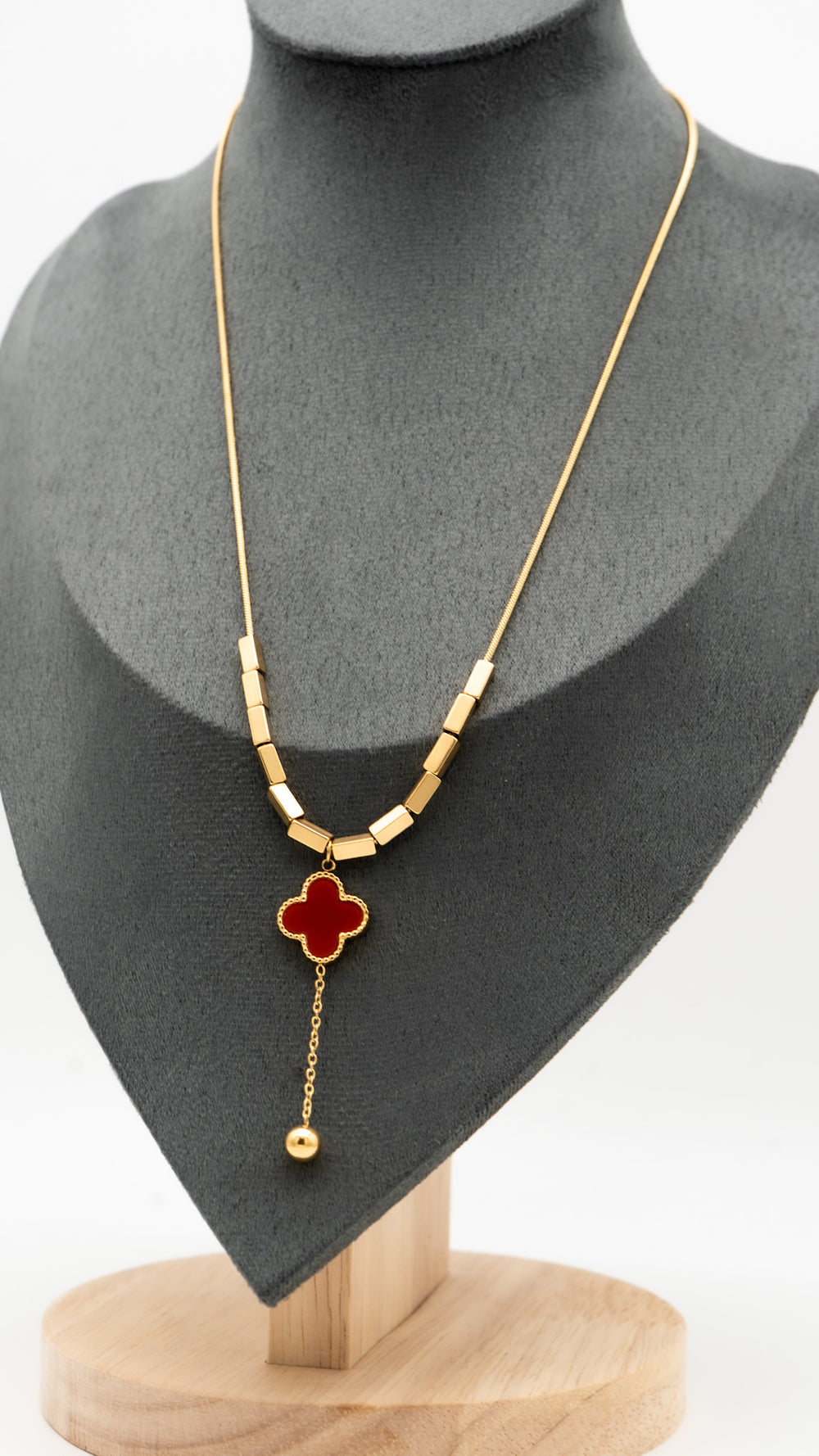 Versatile and eye-catching, the Crimson Flip Necklace features a bold red clover charm on one side and a sleek black on the other — giving you two looks in one. Accented with modern gold block links and a delicate drop chain, this piece blends elegance with playfulness. Whether you're feeling fiery or classic, flip it to match your vibe. Anti-tarnish, hypoallergenic, and crafted with premium gold plating for everyday luxe.