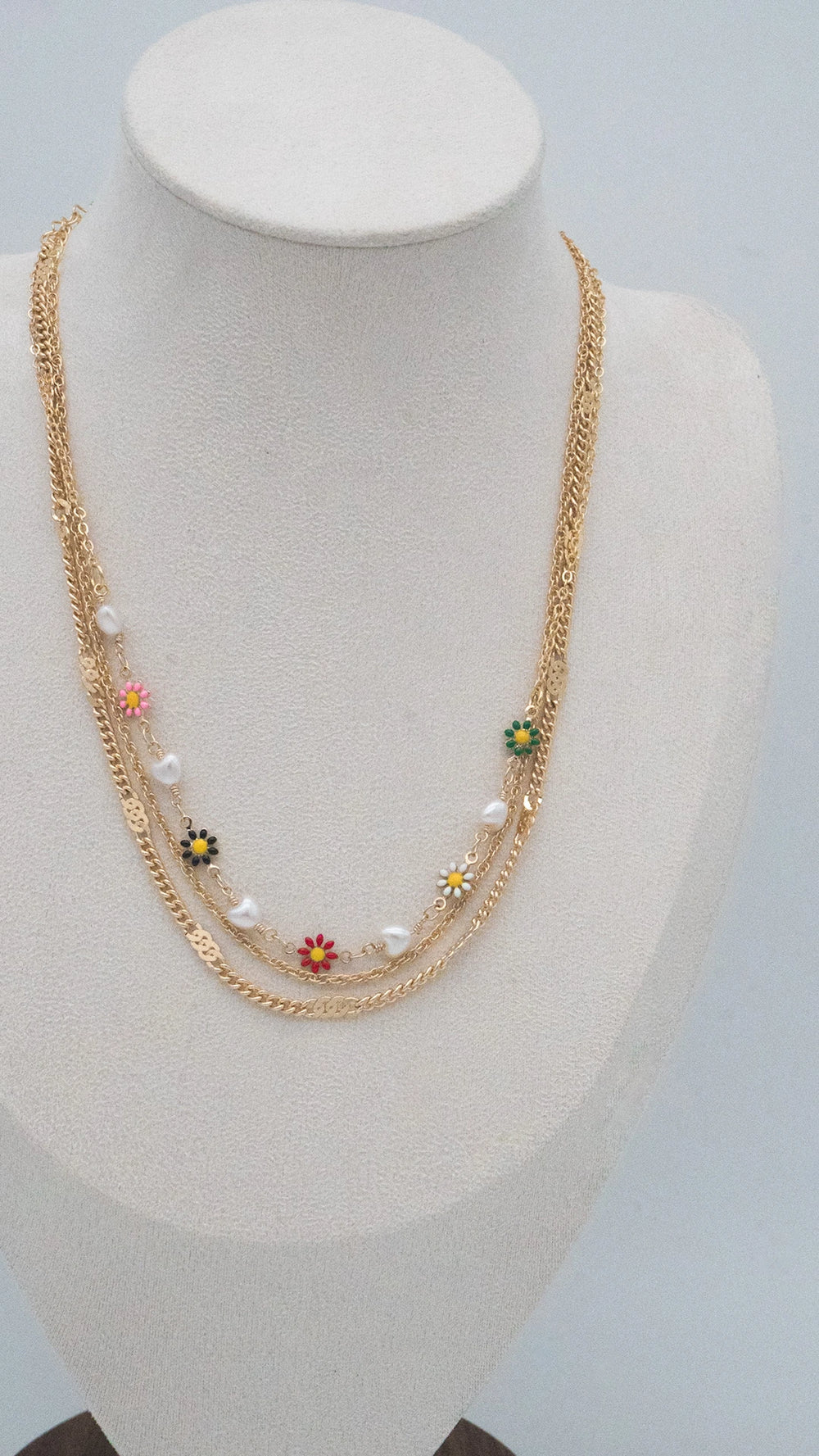Playful, pretty, and full of charm — Whimsy Flora is a layered gold necklace that captures the magic of a blooming garden. With dainty enamel flowers in cheerful colors and soft pearl accents, it brings a lighthearted, feminine touch to any outfit. Wear it solo for a subtle statement or layer it with your favorites to create a dreamy, boho-inspired look.