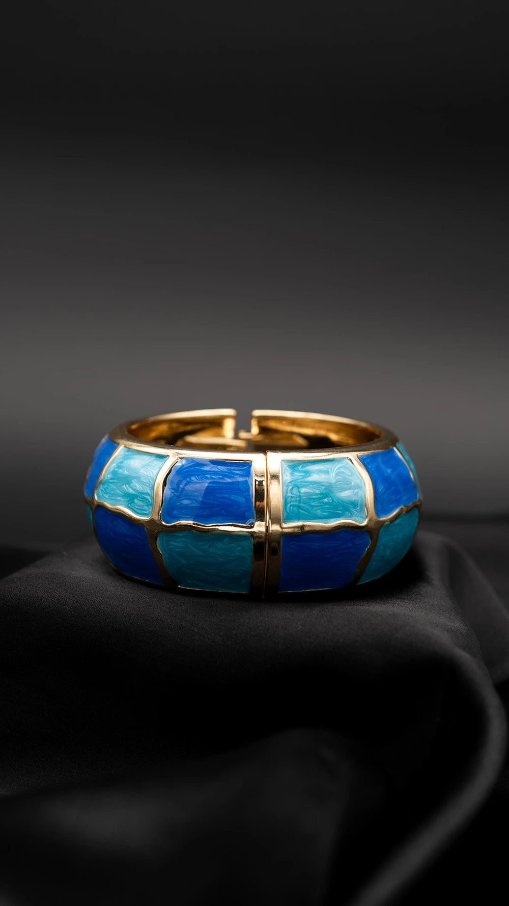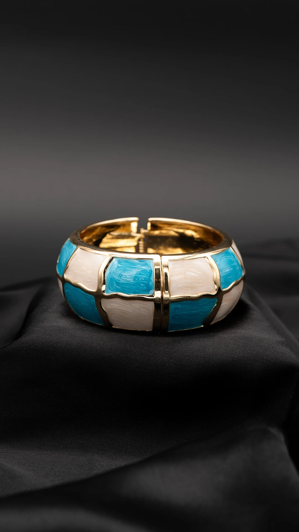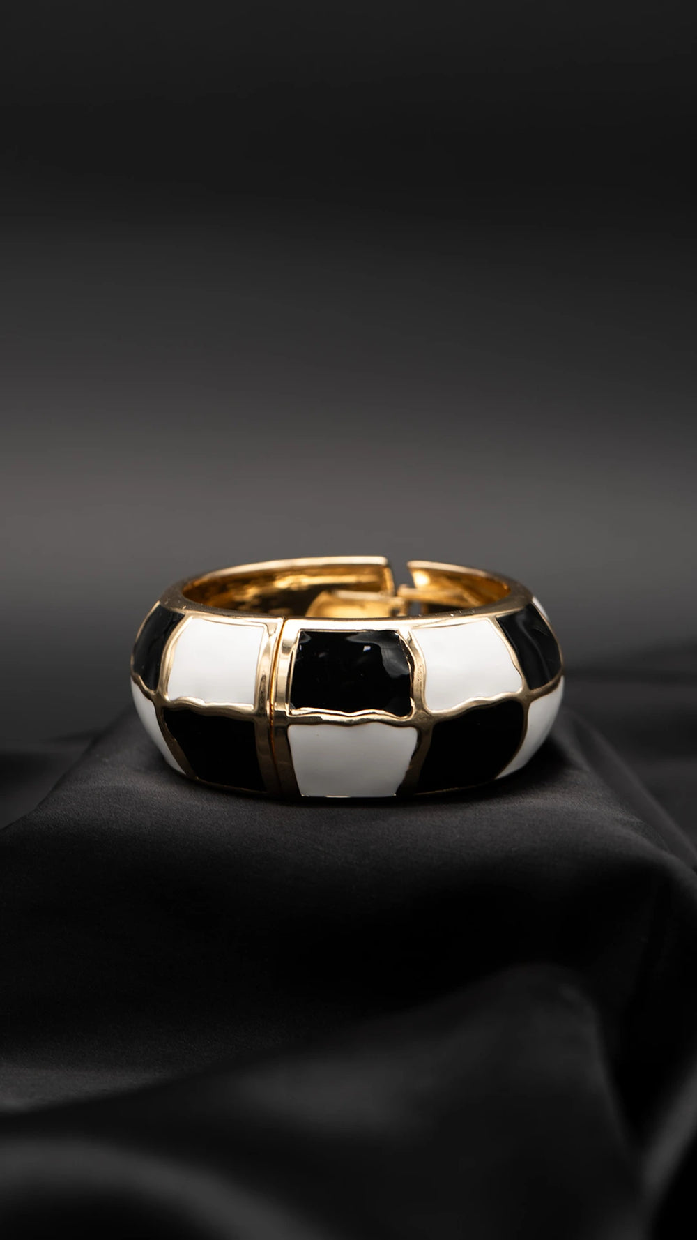 Bold and sculptural, the Sira Bangle is defined by its structured silhouette and statement grid design. Featuring curved enamel segments outlined with raised metallic borders, it creates a seamless balance of elegance and edge. The domed profile adds volume and depth, while the open-back closure ensures a secure and comfortable fit.