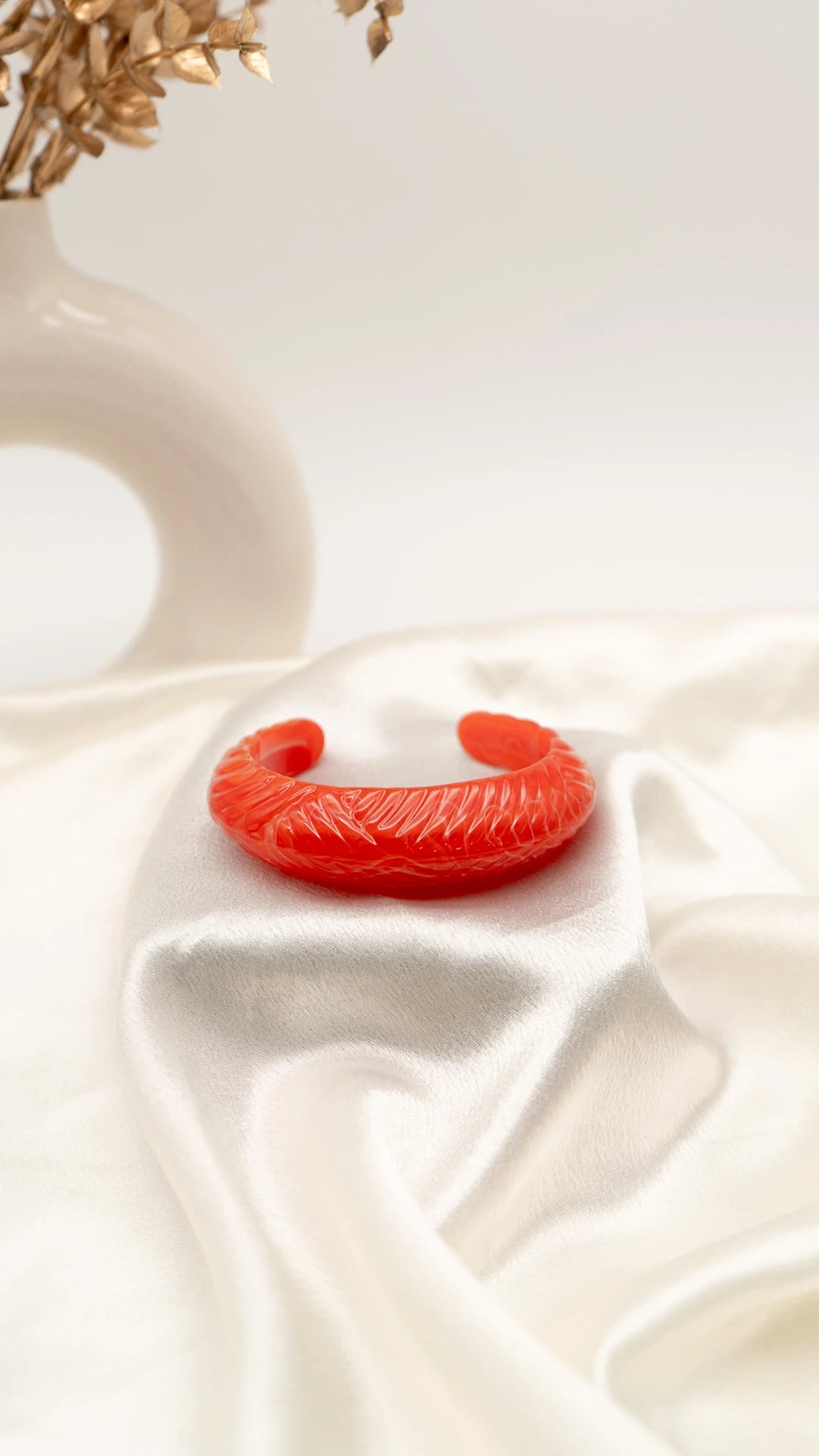 Vibrant, bold, and full of personality — the Scarlet Twist Resin Bangle is your pop of color in jewelry form. Crafted in a rich scarlet red with a twisted, textured design, it adds instant energy to any outfit. Lightweight yet eye-catching, it’s perfect for stacking with other bangles or wearing solo as a statement piece.