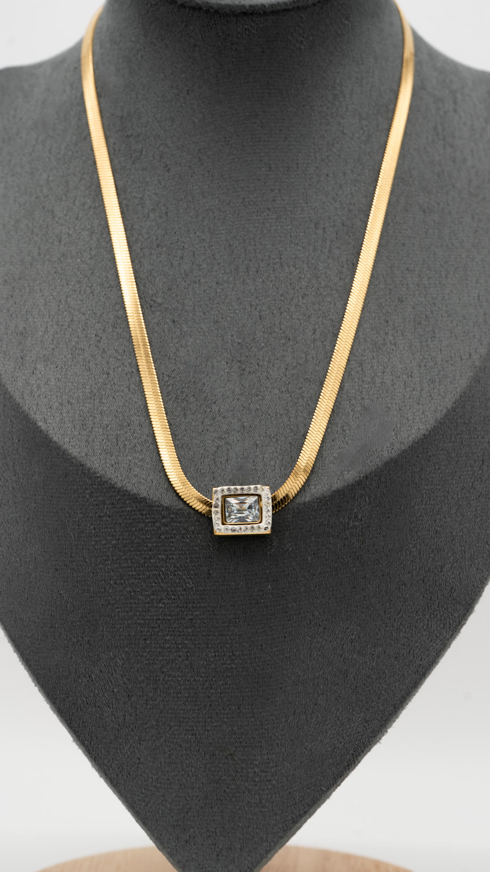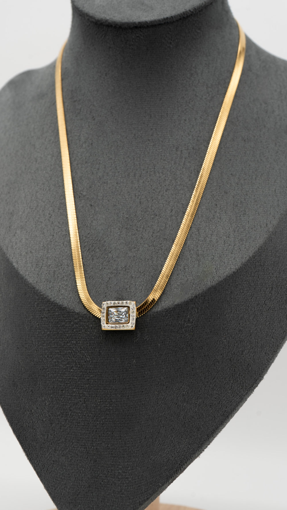 Timeless elegance meets modern luxury in the Luxe Vault Necklace. Featuring a sleek gold snake chain and a bold rectangular crystal pendant framed with delicate pavé accents, this piece is the definition of refined sophistication. Crafted from ultra high-quality, tarnish-resistant materials, it’s made to shine for years to come. Whether worn solo or layered, the Luxe Vault adds a touch of quiet opulence to any outfit. Designed for the woman who knows that true style is in the details.