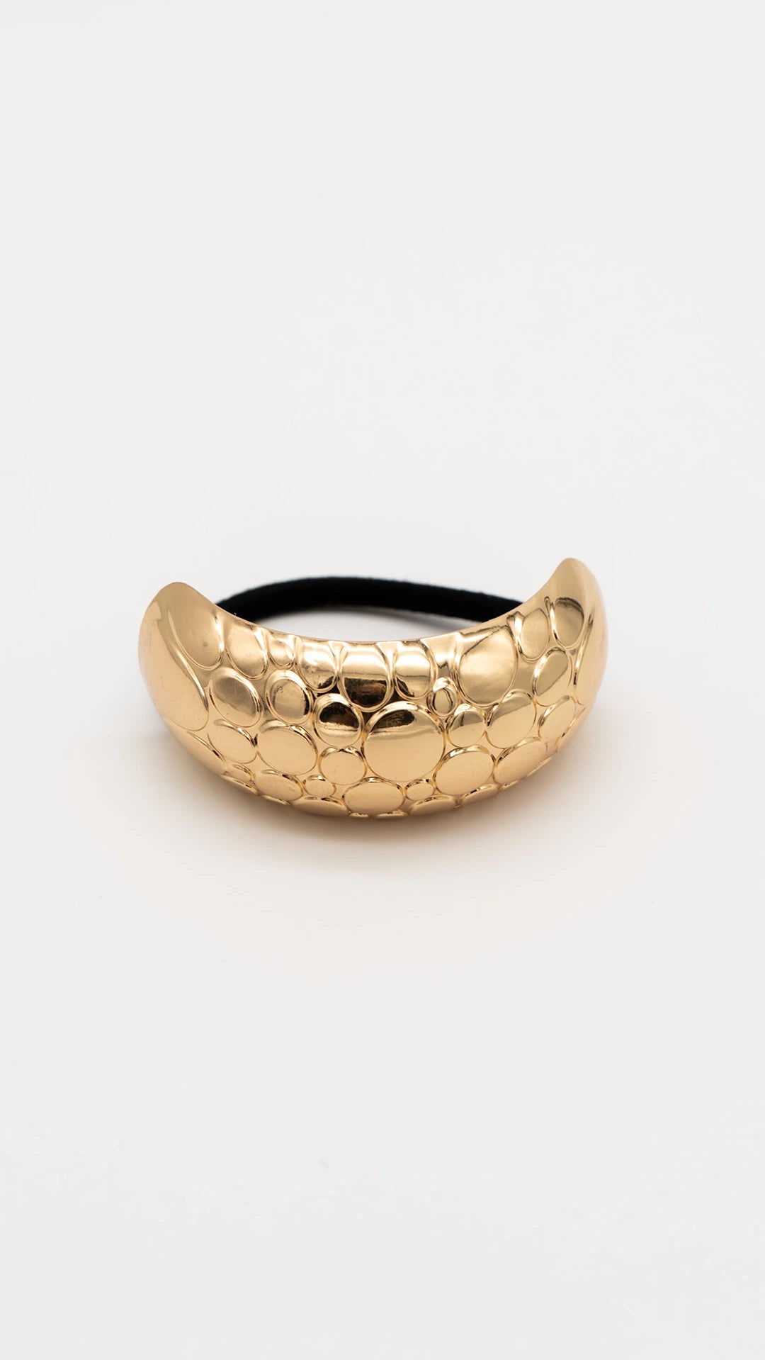 Bold yet fluid — Molten Pebble brings a sculptural twist to your everyday hair game. With its rounded form and pebble-like texture, this gleaming gold hair tie adds an effortless shine to buns, ponytails, or even your wrist. Perfect for days when you want just one accessory to make a statement.