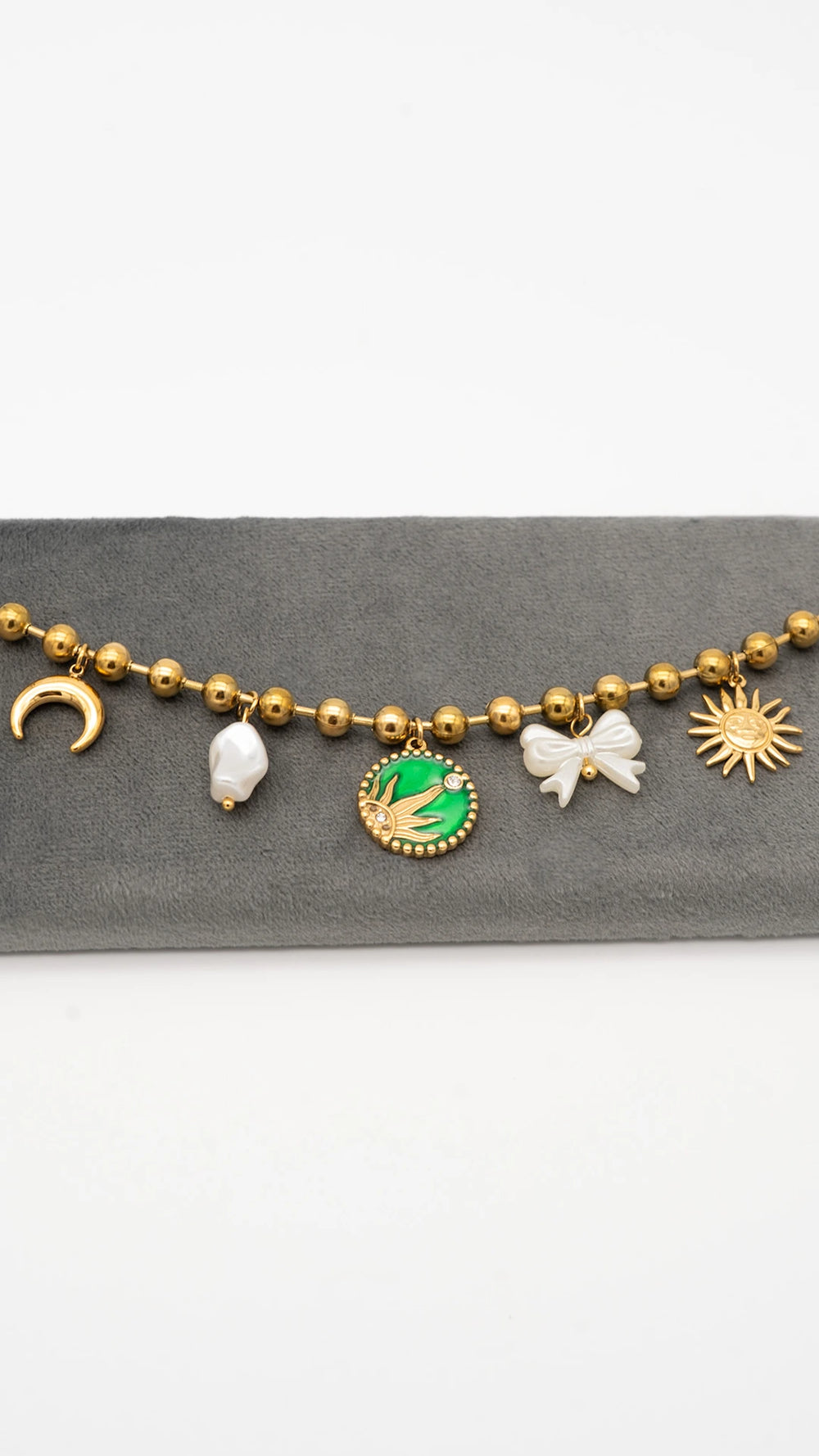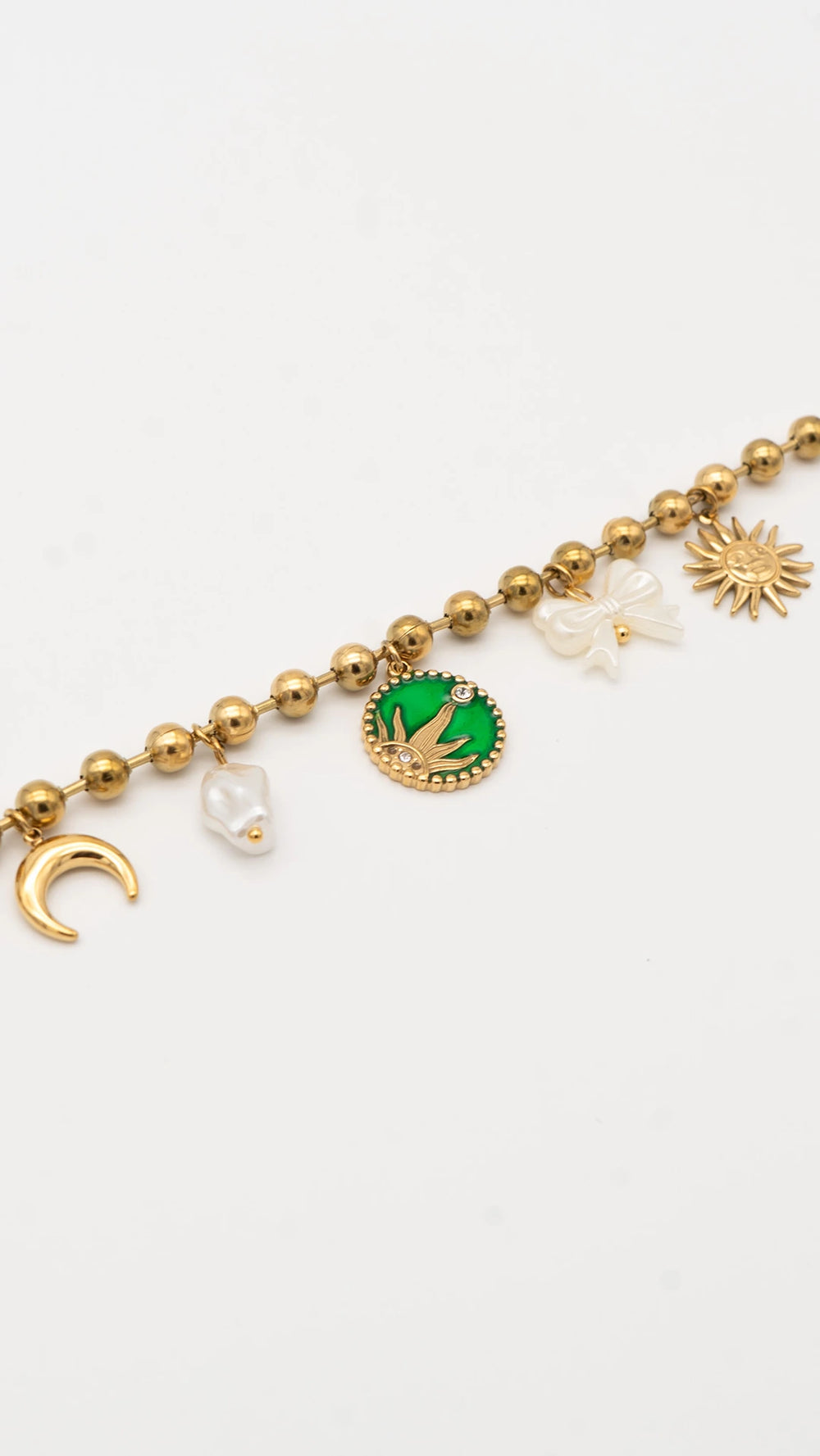 Adorned with radiant charms like the crescent moon, blazing sun, pearl bow, and a vivid green talisman, this bracelet feels like a story written in stardust.