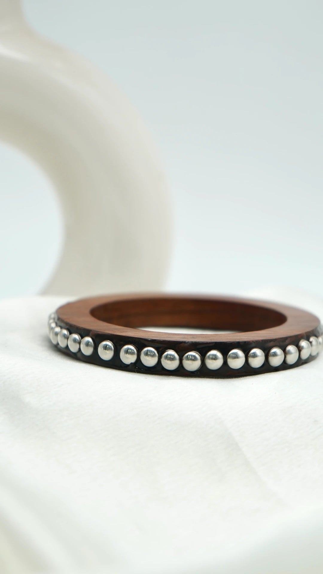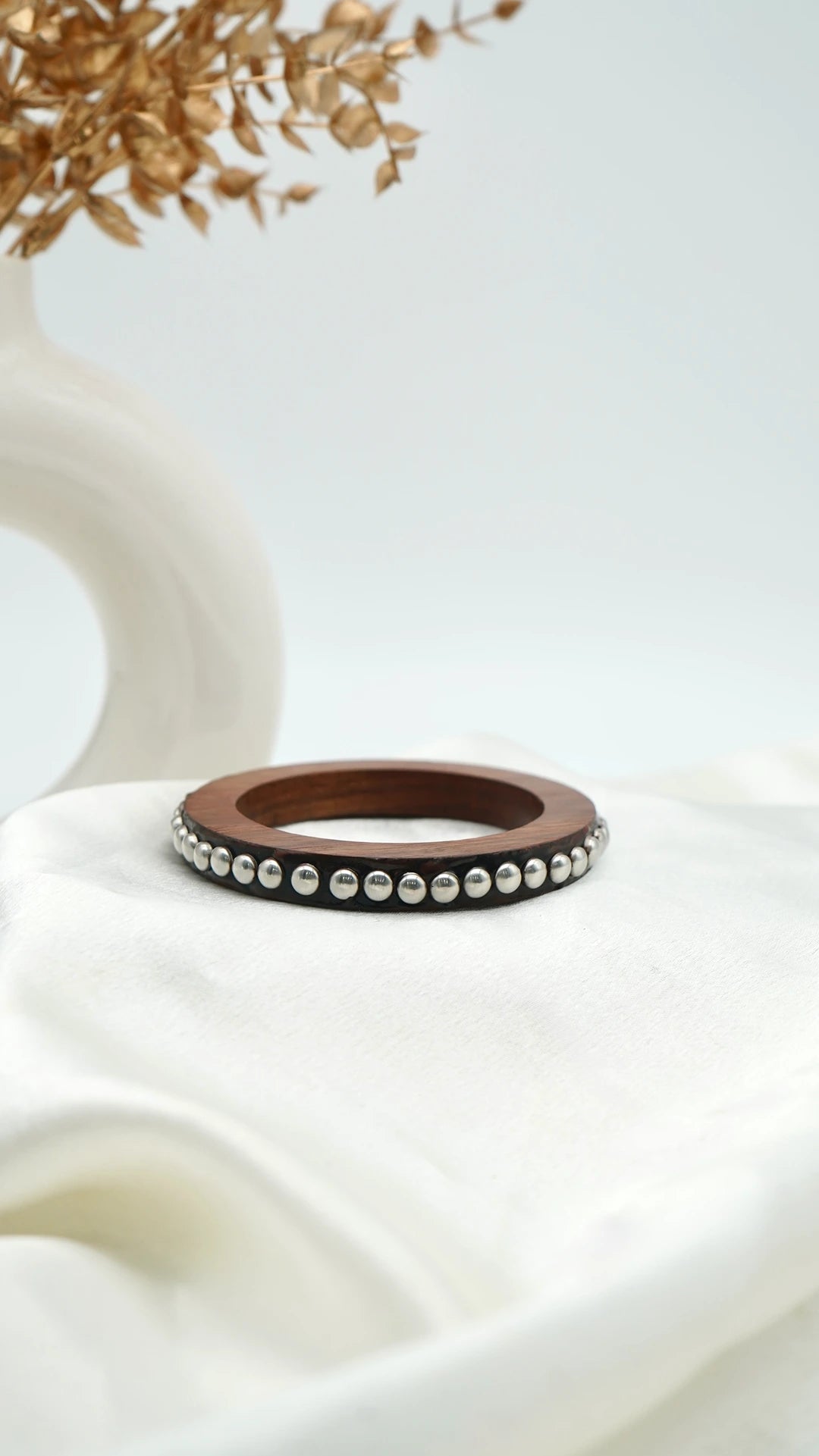 The Silver Bead Wooden Bangle is where rustic charm meets modern elegance. Handcrafted from smooth, dark wood, it features a fine row of polished silver beads that trace the outer rim, creating a subtle contrast between earthy warmth and metallic shine.