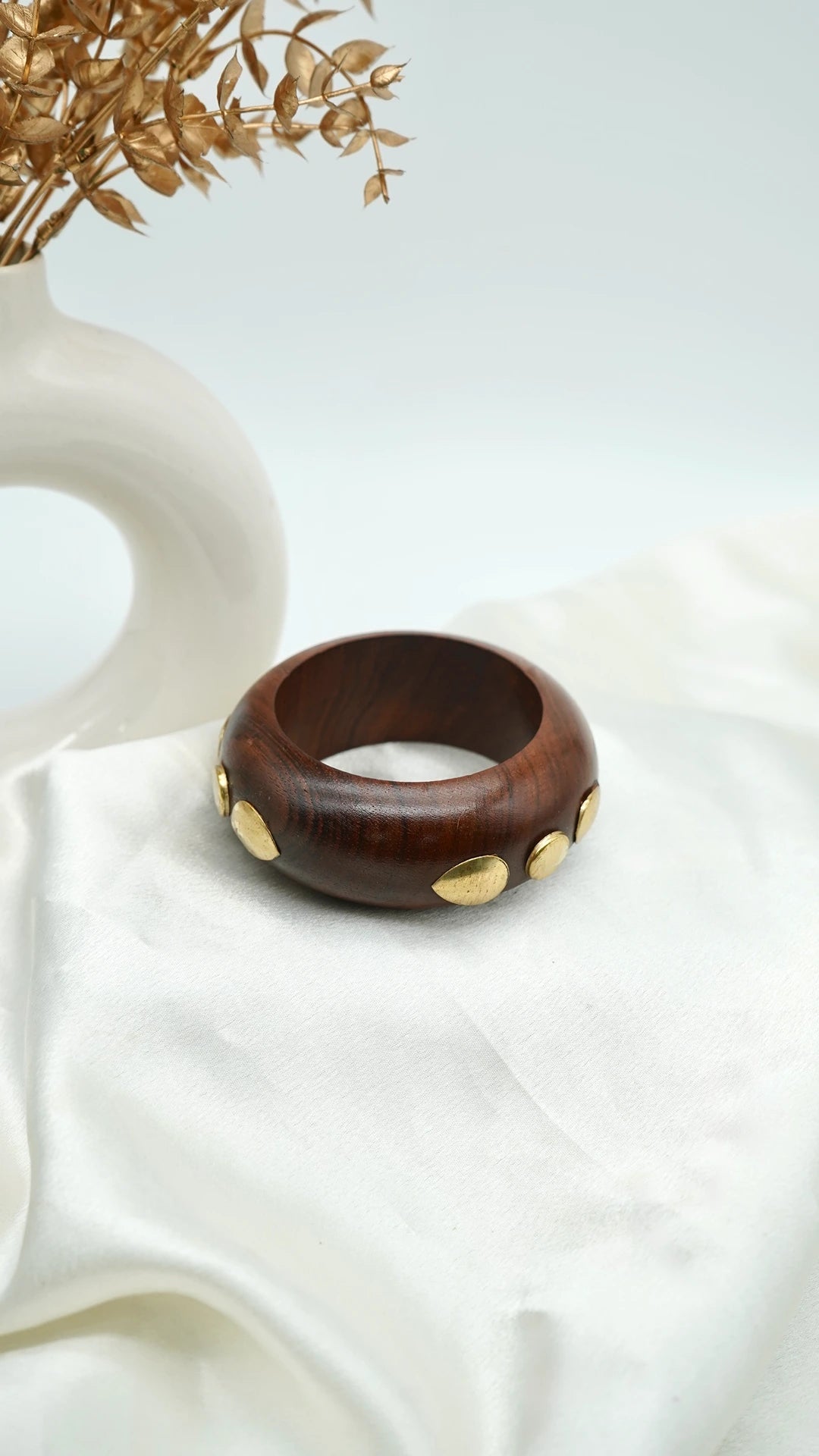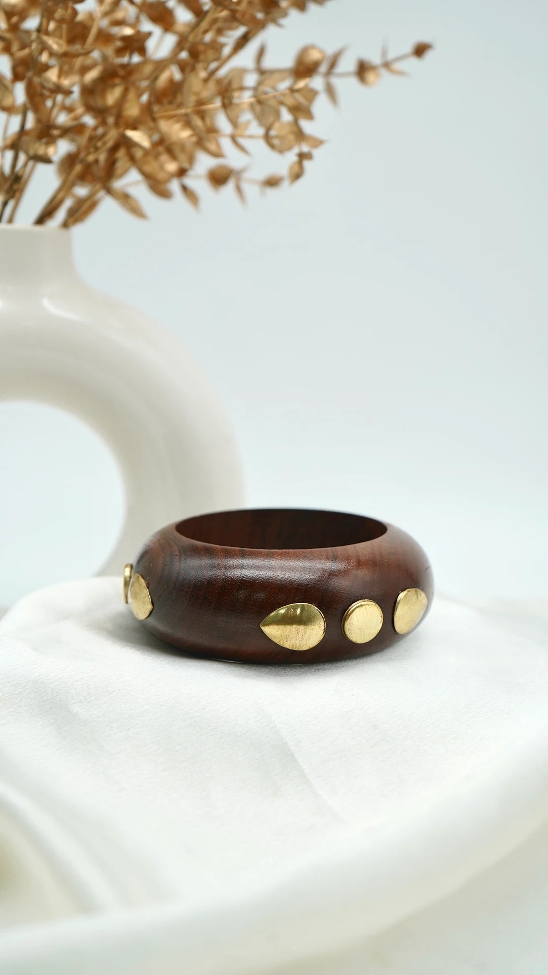 The Golden Dew Wooden Bangle is a radiant blend of nature and elegance. Handcrafted from smooth, dark-toned wood, it’s adorned with delicate golden drops that glimmer softly against the warm grain — reminiscent of morning dew catching the first light. The rounded silhouette and polished finish lend it an effortless, organic charm that feels both modern and timeless.