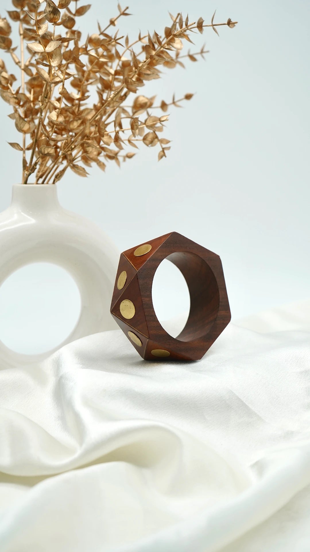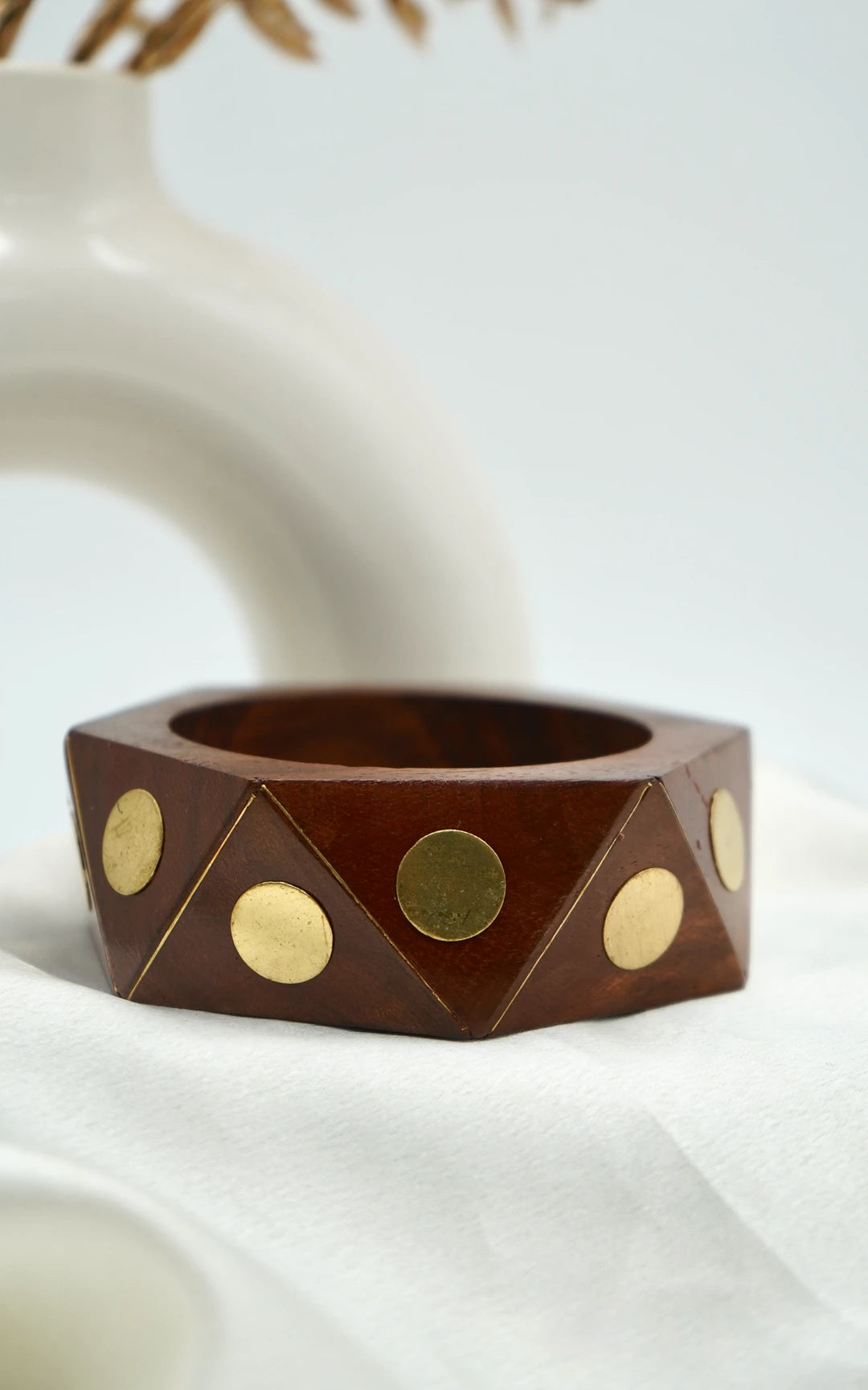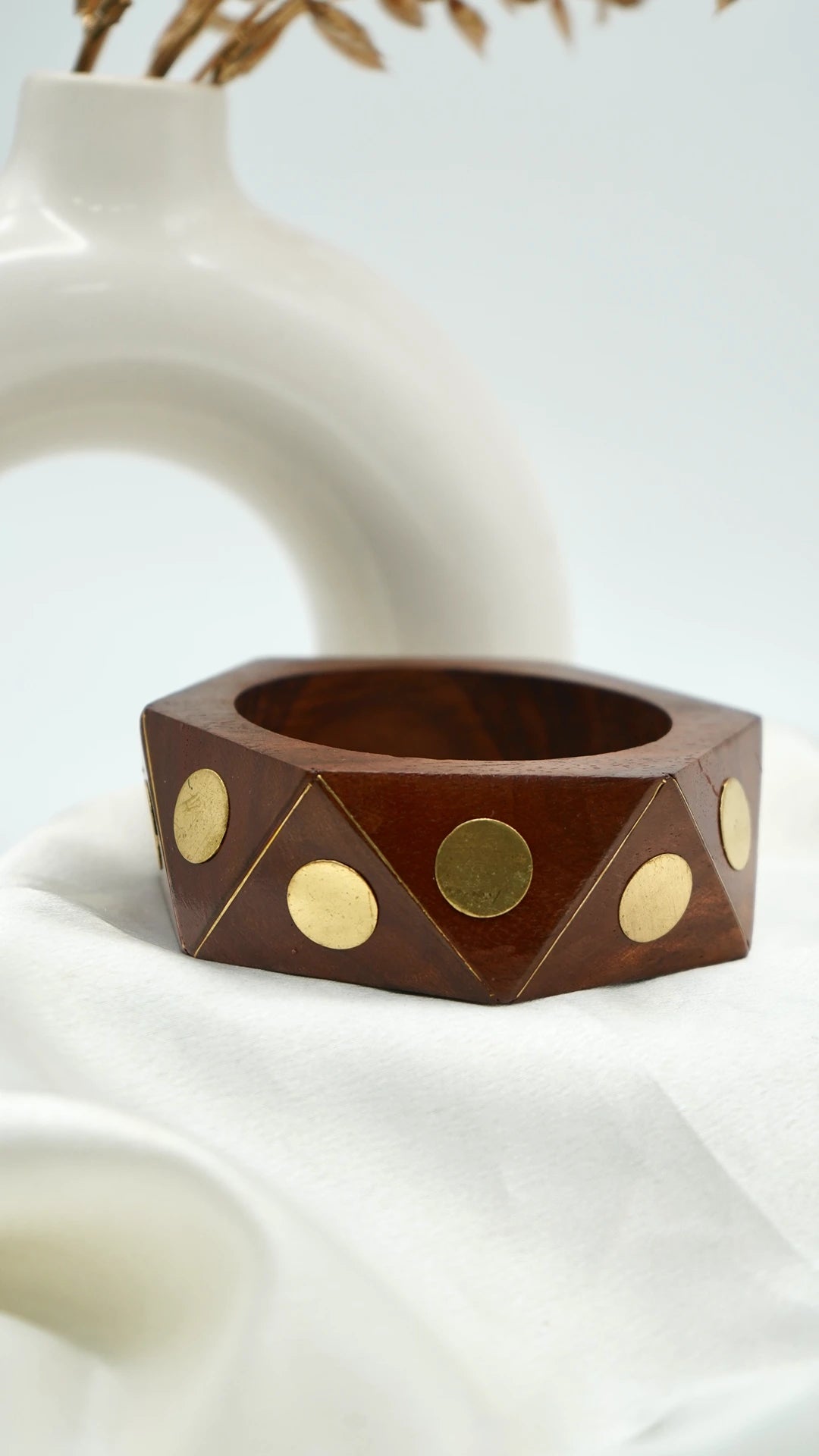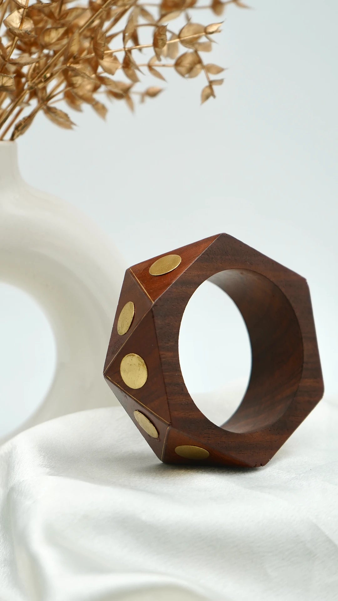 The Modern Relic Wooden Bangle blends ancient craftsmanship with a bold, architectural twist. Handcarved from richly grained wood, its faceted shape and golden inlays evoke the precision of modern design while retaining the warmth and soul of tradition. Each polished surface catches the light, revealing the contrast between matte wood and metallic gleam.