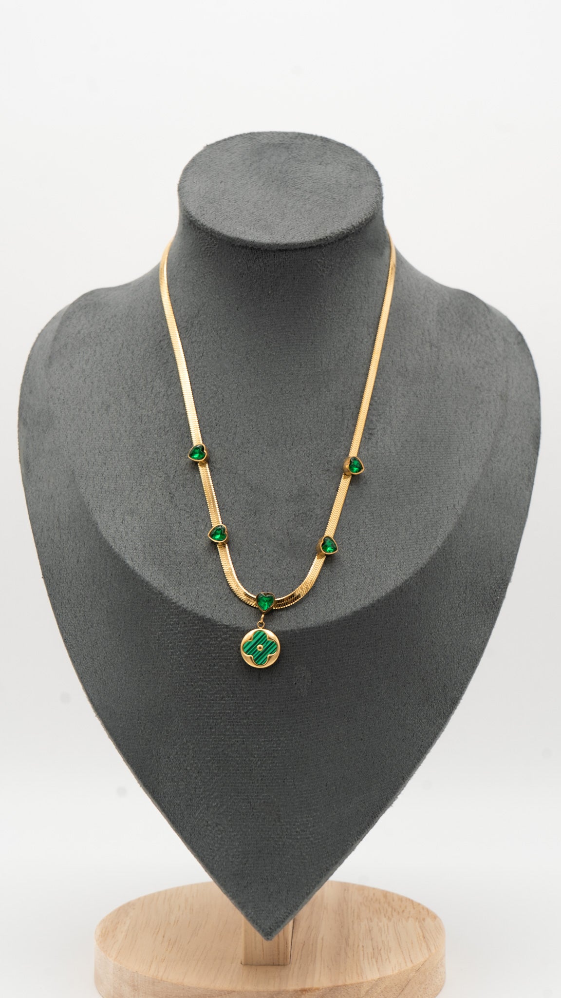 Delicate yet striking, Verdelune Necklace is a golden ode to elegance and enchantment. Featuring rich green heart-shaped stones set along a sleek dual-layer chain, this necklace is anchored by a signature clover charm — reminiscent of moonlit gardens and mystical nights. The vibrant green and gold pairing evokes balance, beauty, and bold femininity.