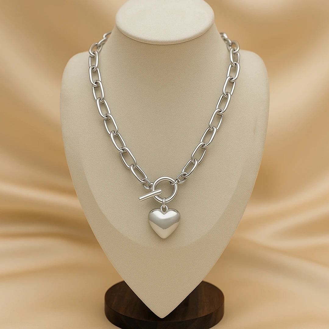 Bold yet timeless, the Silver Metallic Heart necklace features a chunky silver chain crowned with a sleek, high-shine heart pendant. Crafted to reflect strength and softness in perfect balance, this piece is a statement of modern love and unapologetic style. Wear it solo for a confident edge or layer it to amplify your look—either way, all eyes will follow.