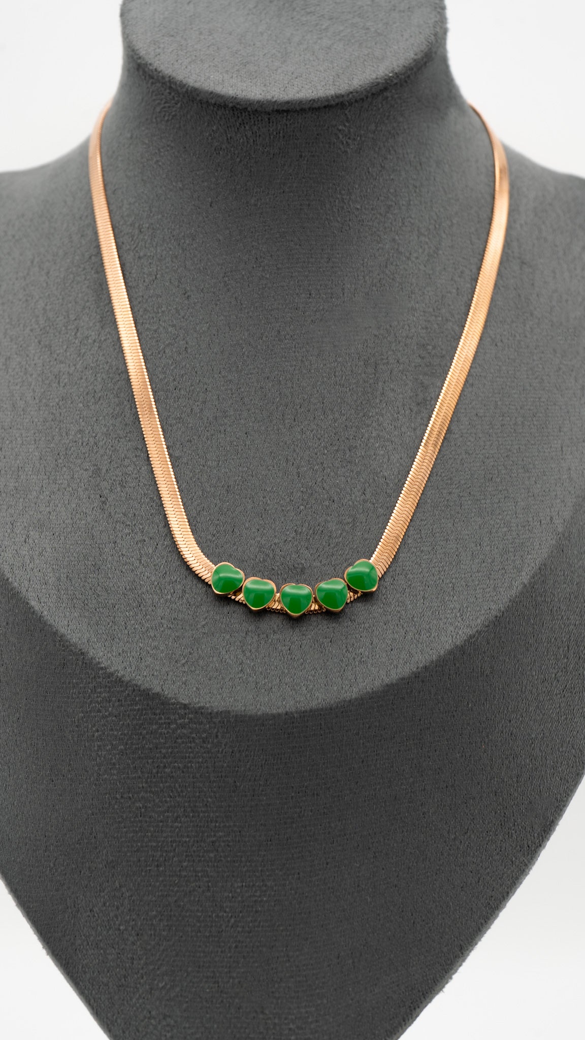 A poetic fusion of grace and boldness, Zeloura captures the essence of modern elegance. Featuring five perfectly sculpted green heart stones set against a sleek rose gold chain, this piece radiates balance, beauty, and charm. The vibrant green pops against the warm gold, creating a striking yet wearable statement.Crafted with ultra high-quality stainless steel and premium rose gold plating, Zeloura is anti-tarnish, hypoallergenic, and made to last. Whether styled solo or layered, it’s a symbol of strength wrapped in sophistication.